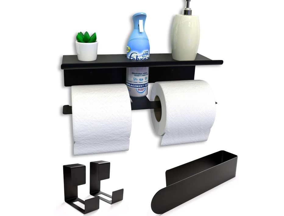 ✨ Accesorios de baño en metal negro mate con portarrollos doble con balda, toallero y ganchos, instalación sin taladro y fijación segura