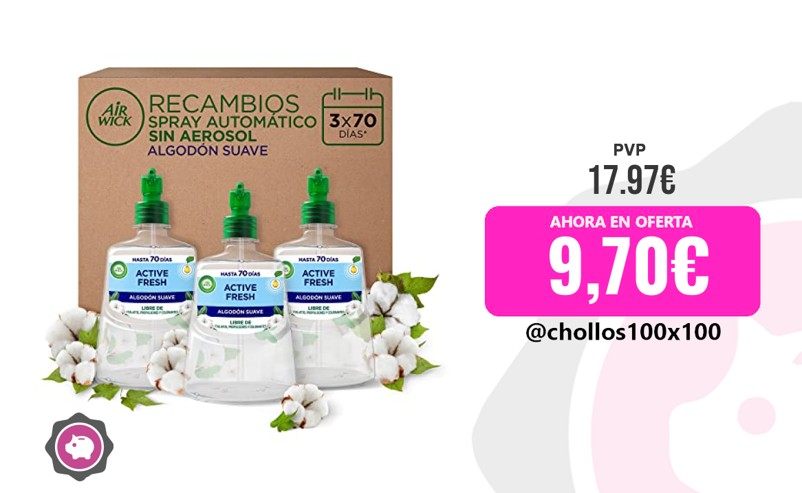 ✨¡Dale un respiro a tu hogar con Air Wick Active Fresh! 🌬️ Olvídate de aerosoles y disfruta de un aroma a algodón puro, infusionado con aceites esenciales naturales. 🌸 Con un frescor que dura hasta 70 días y una fórmula sin químicos dañinos, ¡tu casa olerá de maravilla de forma natural! ✨ Consigue tu pack de 3 recambios y transforma tu ambiente. 🏡
