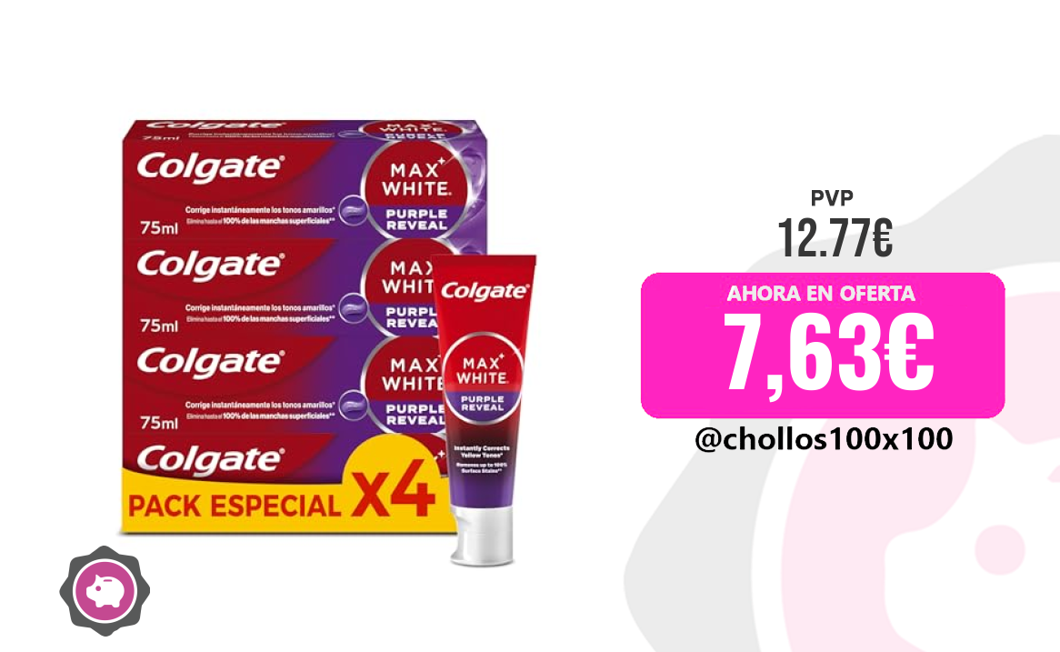 ✨¡Dile adiós a los dientes amarillos al instante con Colgate Max White Purple Reveal! ✨ Su fórmula inspirada en la ciencia del color corrige temporalmente los tonos amarillos para una sonrisa visiblemente más blanca desde el primer cepillado. Además, elimina hasta el 100% de las manchas superficiales. ¡Consíguela ahora, solo en Amazon, y presume de una sonrisa deslumbrante! 💜