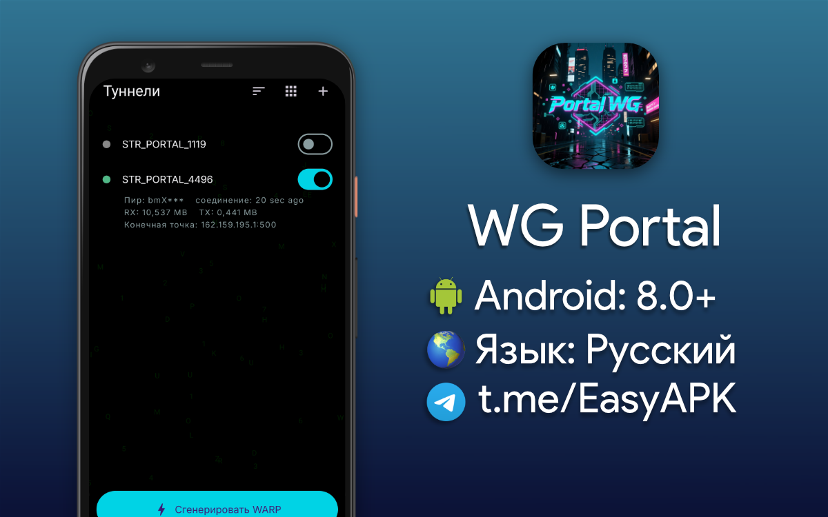 WG Portal — новое приложение от блогера STR Bypass, которое позволяет сгенерировать WARP-конфигурацию и подключиться к ней в два клика. #apps @EasyAPK