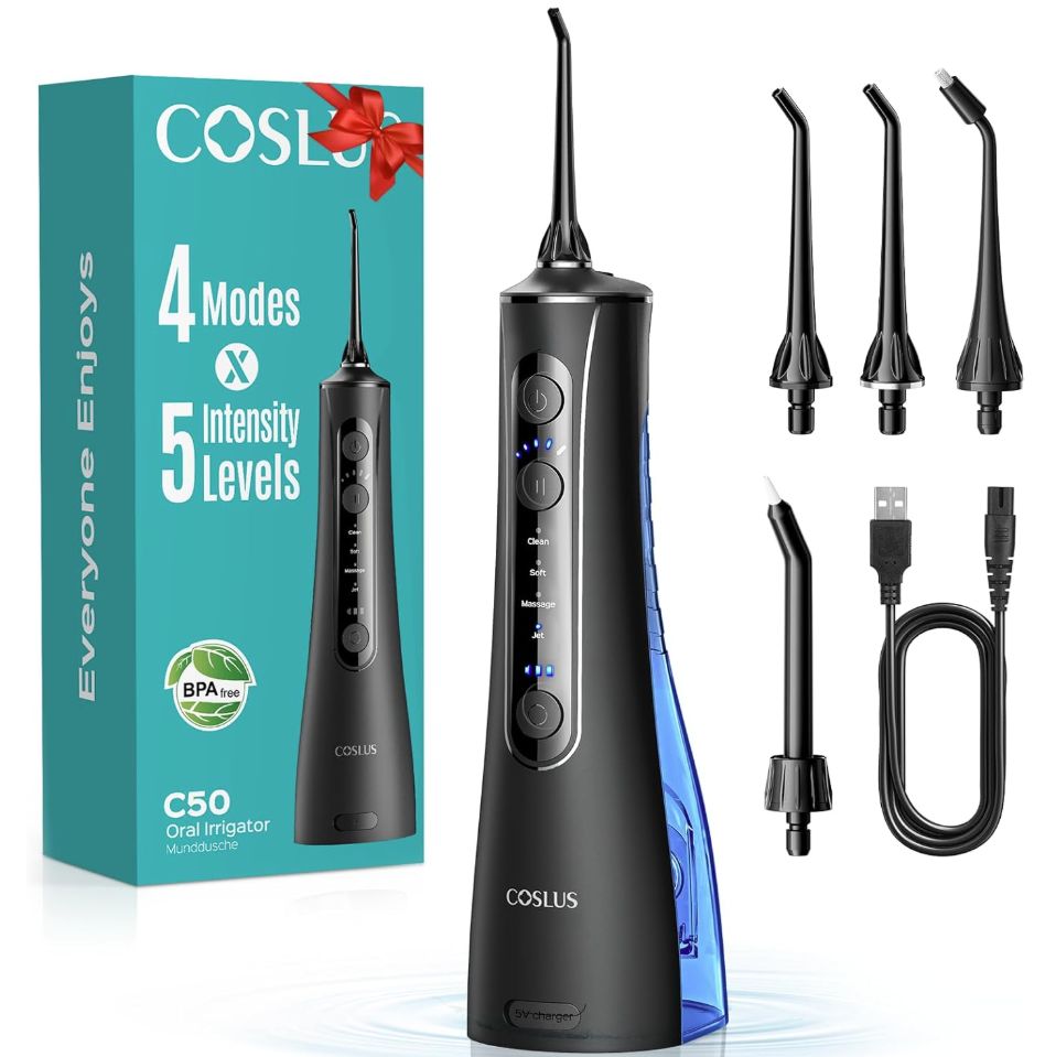 ๐ COSLUS Irrigador Dental Bucal Portatil, 4 Modos y 20 Presiรณn, Inalรกmbrico para Salud Bucal Encรญas Sensibles, con 4 Boquillas. #Amazon
