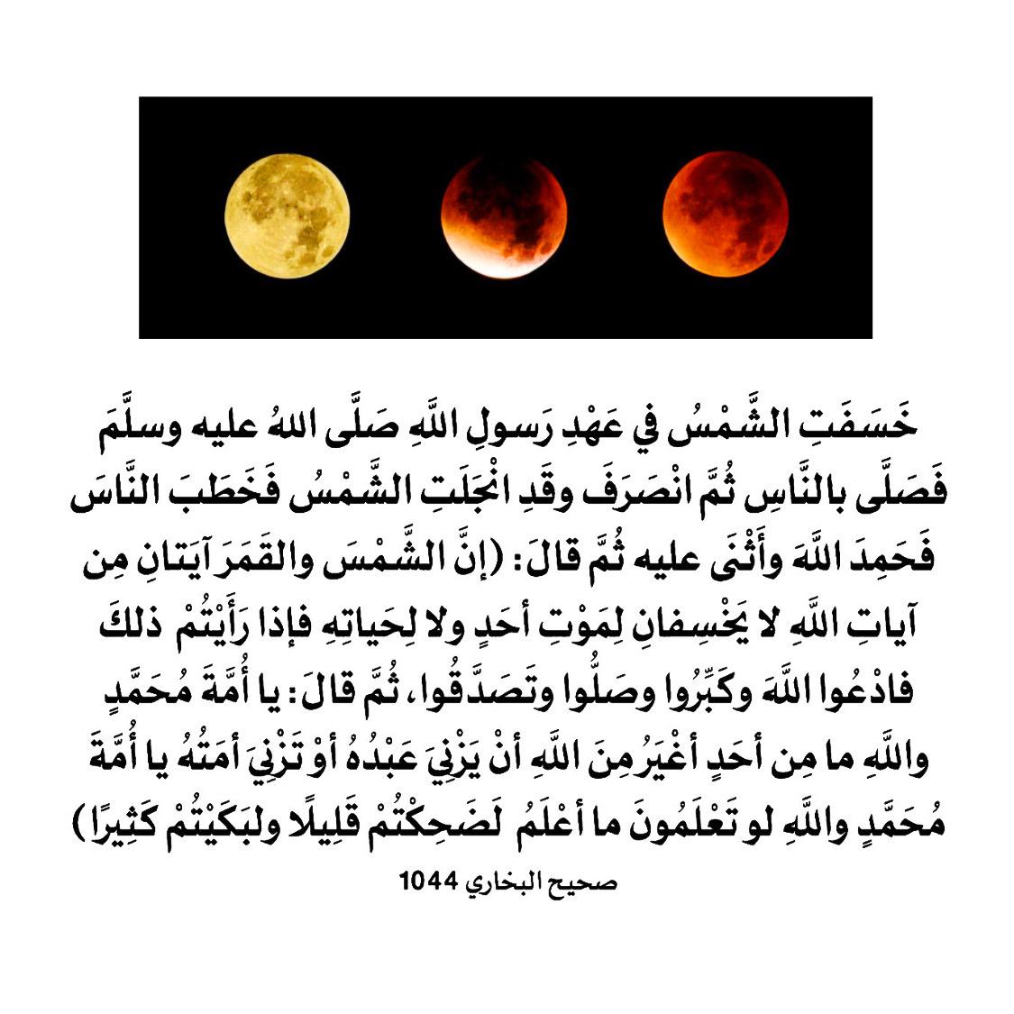 خَسَفَتِ الشَّمْسُ في عَهْدِ رَسولِ اللَّهِ صَلَّى اللهُ عليه وسلَّمَ، فَصَلَّى بالنَّاسِ، ثُمَّ انْصَرَفَ وقَدِ انْجَلَتِ الشَّمْسُ، فَخَطَبَ النَّاسَ، فَحَمِدَ اللَّهَ وأَثْنَى عليه، ثُمَّ قالَ: ( إنَّ الشَّمْسَ والقَمَرَ آيَتانِ مِن آياتِ اللَّهِ، لا يَخْسِفانِ لِمَوْتِ أحَدٍ ولا لِحَياتِهِ، فإذا رَأَيْتُمْ ذلكَ، فادْعُوا اللَّهَ، وكَبِّرُوا وصَلُّوا وتَصَدَّقُوا. ثُمَّ قالَ: يا أُمَّةَ مُحَمَّدٍ واللَّهِ ما مِن أحَدٍ أغْيَرُ مِنَ اللَّهِ أنْ يَزْنِيَ عَبْدُهُ أوْ تَزْنِيَ أمَتُهُ، يا أُمَّةَ مُحَمَّدٍ واللَّهِ لو تَعْلَمُونَ ما أعْلَمُ لَضَحِكْتُمْ قَلِيلًا ولبَكَيْتُمْ كَثِيرًا ).