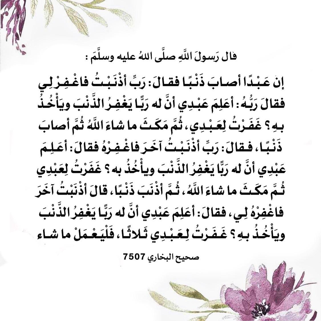 قال النبـي صلى الله عليه وسلم : ( إنَّ عَبْدًا أصابَ ذَنْبًا فقالَ: رَبِّ أذْنَبْتُ فاغْفِرْ لِي، فقالَ رَبُّهُ: أعَلِمَ عَبْدِي أنَّ له رَبًّا يَغْفِرُ الذَّنْبَ ويَأْخُذُ بهِ؟ غَفَرْتُ لِعَبْدِي، ثُمَّ مَكَثَ ما شاءَ اللَّهُ ثُمَّ أصابَ ذَنْبًا، فقالَ: رَبِّ أذْنَبْتُ آخَرَ فاغْفِرْهُ فقالَ: أعَلِمَ عَبْدِي أنَّ له رَبًّا يَغْفِرُ الذَّنْبَ ويَأْخُذُ بهِ؟ غَفَرْتُ لِعَبْدِي، ثُمَّ مَكَثَ ما شاءَ اللَّهُ، ثُمَّ أذْنَبَ ذَنْبًا، قالَ أذْنَبْتُ آخَرَ فاغْفِرْهُ لِي، فقالَ: أعَلِمَ عَبْدِي أنَّ له رَبًّا يَغْفِرُ الذَّنْبَ ويَأْخُذُ بهِ؟ غَفَرْتُ لِعَبْدِي ثَلاثًا، فَلْيَعْمَلْ ما شاء )