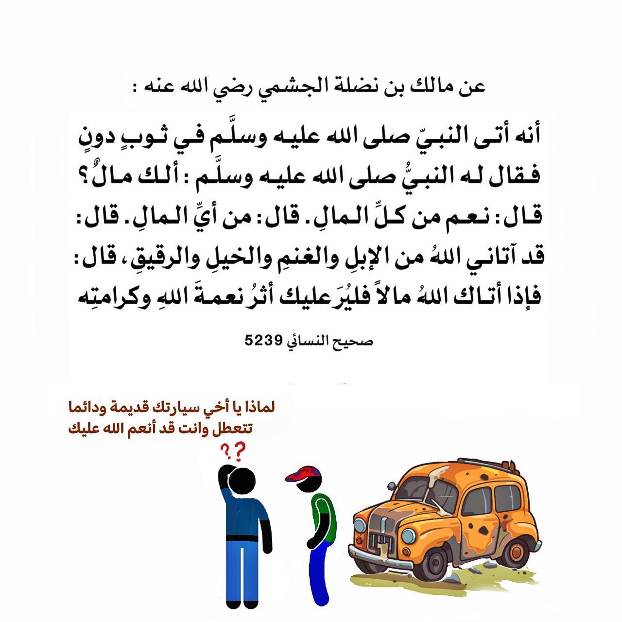 أنه أتى النبيَّ صلى الله عليه وسلَّم في ثوبٍ دونٍ فقال له النبيُّ صلى الله عليه وسلَّم: ألك مالٌ؟ قال: نعم من كلِّ المالِ. قال: من أيِّ المالِ. قال قد آتاني اللهُ من الإبلِ والغنمِ والخيلِ والرقيقِ. قال: فإذا أتاك اللهُ مالاً فليُرَ عليك أثرُ نعمةَ اللهِ وكرامتِه.