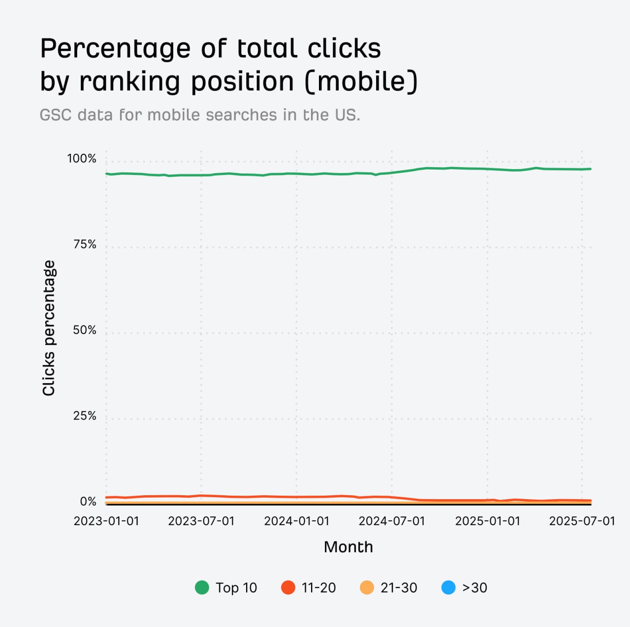 Недавний тренд показывает снижение кликов для URL, ранжирующихся дальше 10-й позиции, что указывает на еще большую концентрацию вовлеченности юзеров на первой странице мобильных SERP.