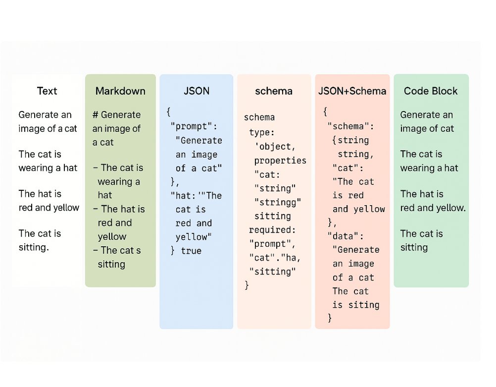 Промптинг текстом, в Markdown, JSON, Schema, JSON+Schema или блоком кода.