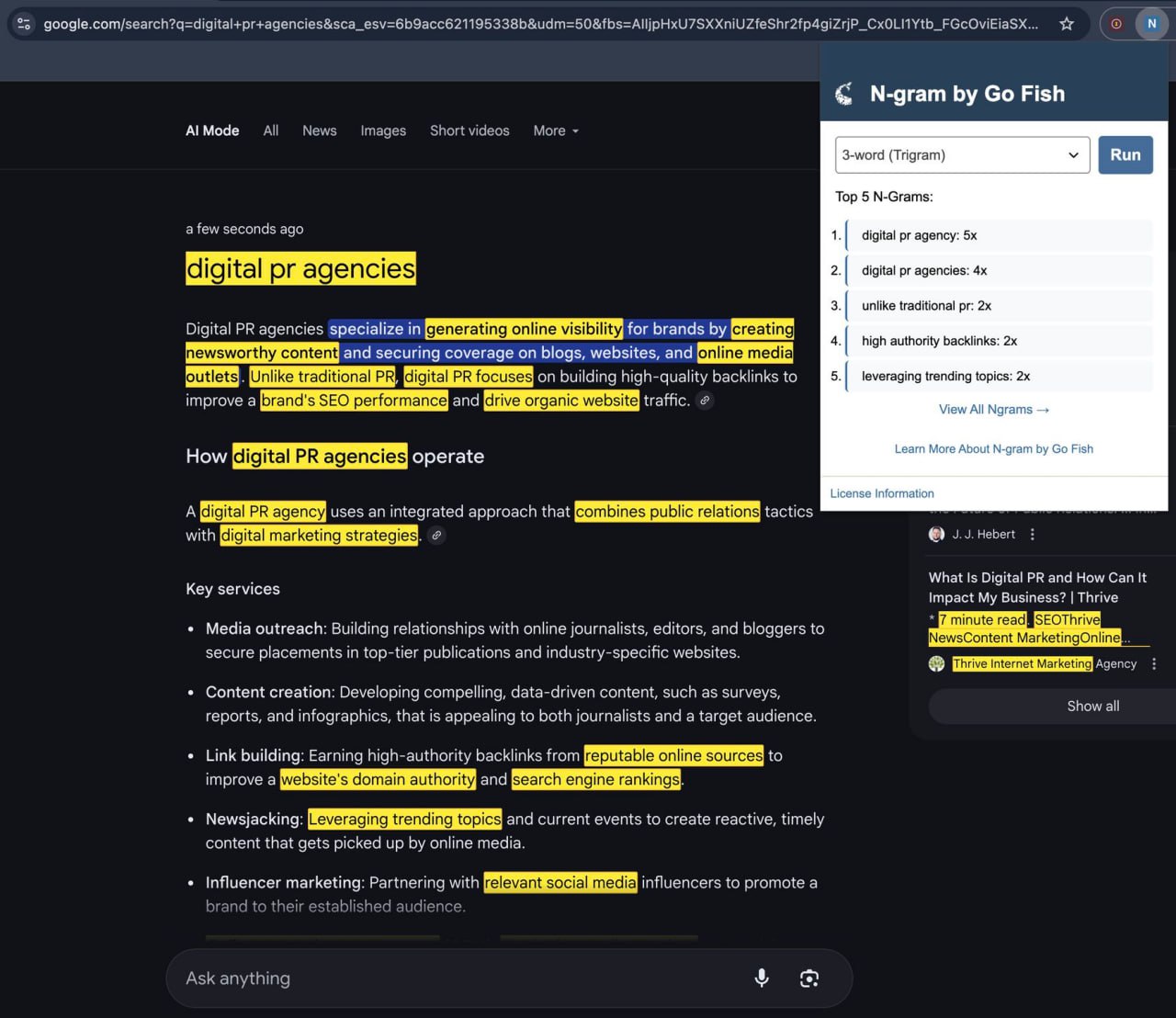 На скриншоте ниже показано, что происходит, когда вы выполняете поиск по запросу "digital PR agencies" и накладываете результаты n-gram анализа на ответ, сгенерированный искусственным интеллектом.