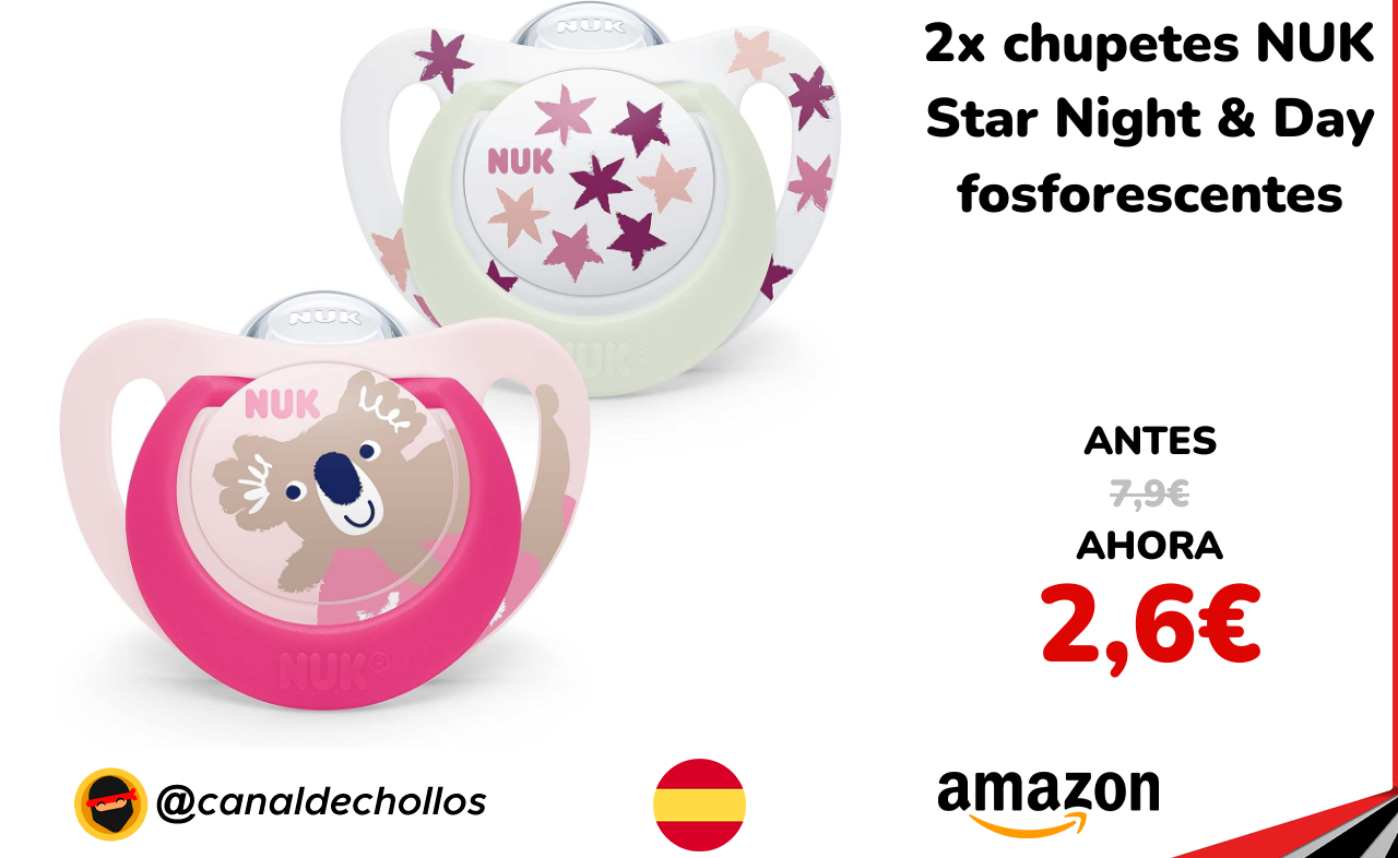 ✨ Precio chollo para este set de chupetes NUK Star Night & Day de silicona libre de BPA, diseñado para bebés de 6 a 18 meses. Incluye dos unidades con efecto fosforescente que facilita encontrarlos en la oscuridad. Su tetina anatómica favorece el desarrollo bucal natural y el escudo con orificios mejora la ventilación. Vendido y enviado por Amazon.