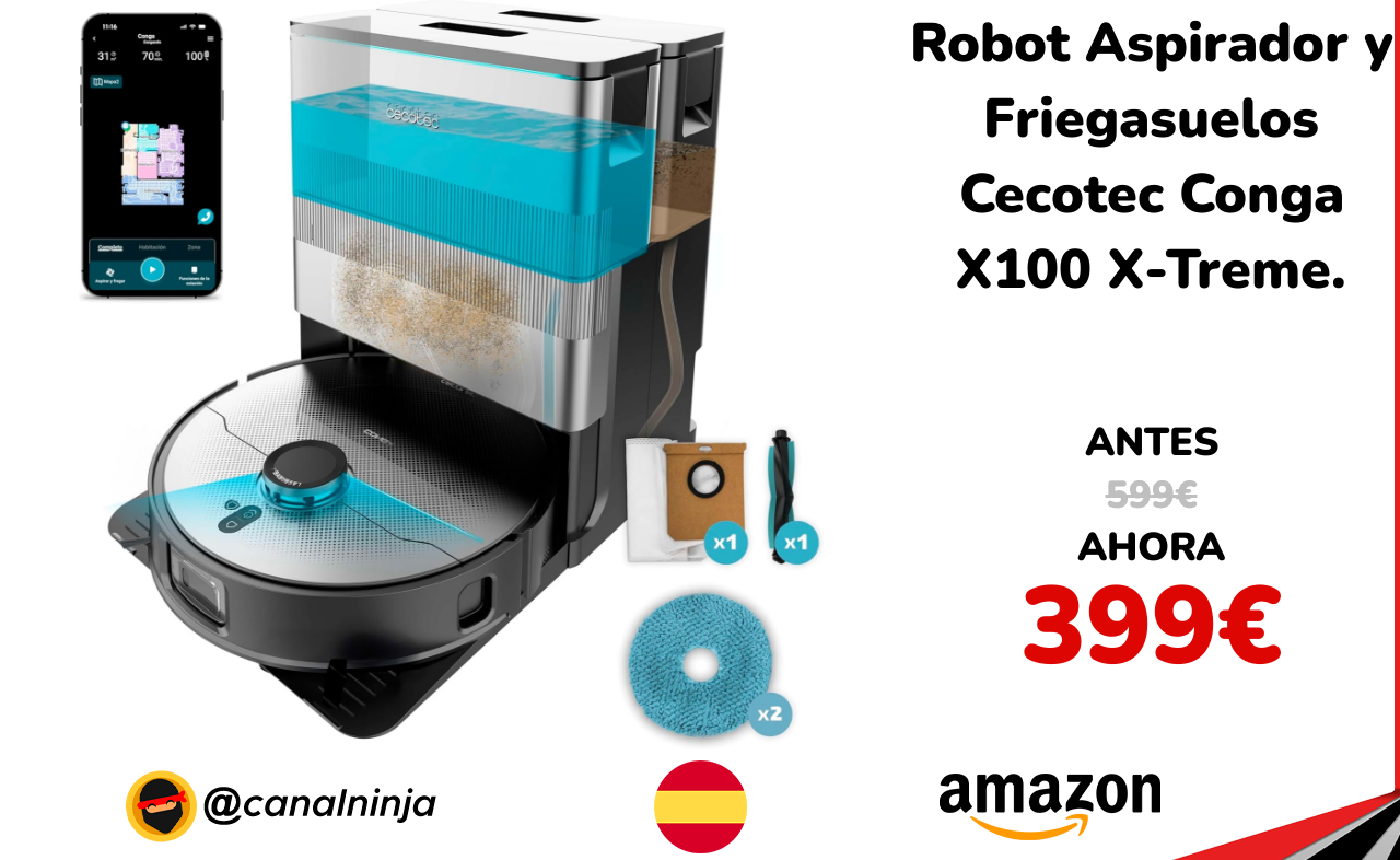 🔹 Robot Aspirador y Friegasuelos Cecotec Conga X100 X-Treme. solo 399€ ❗️⚔️️ (PVP: 599€)