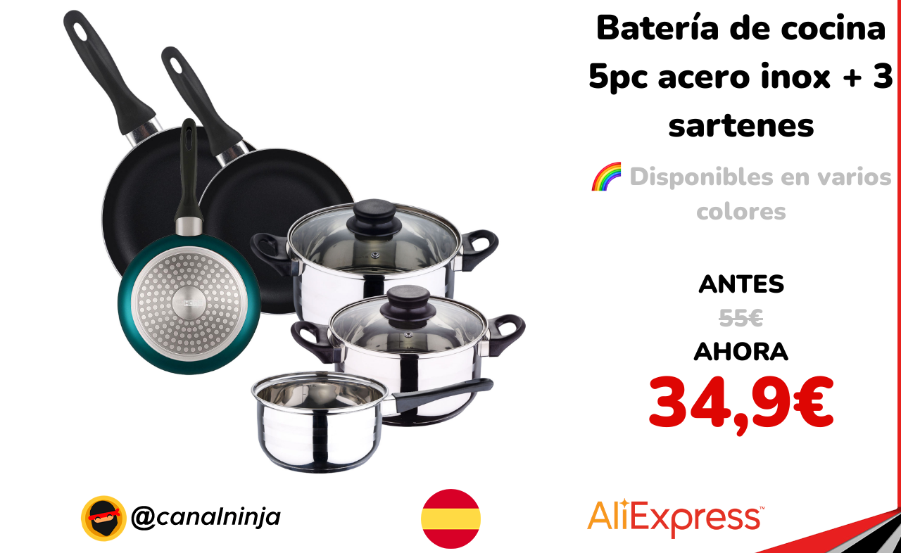 🔹 Batería de cocina 5pc acero inox + 3 sartenes solo 34,9€ ❗️⚔️️ (PVP: 55€)