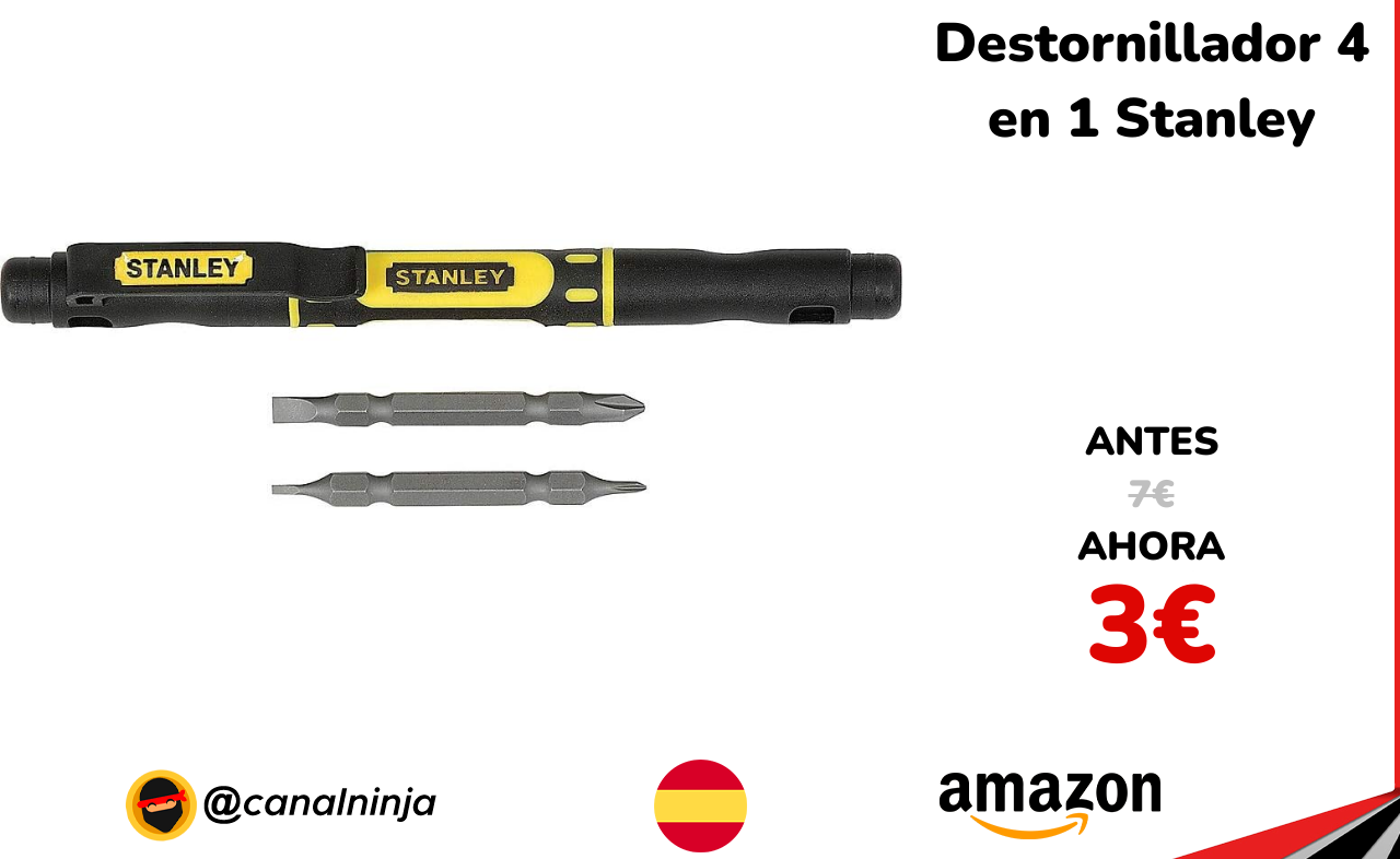 ✨ Precio barato para este destornillador 4 en 1 de la marca Stanley. Tiene forma de bolígrafo, con agarre incluido y en el puedes guardar las 2 puntas de doble cara que trae. Muy práctico para realizar trabajos en casa o para llevarlo a cualquier lugar. Vendido y enviado por Amazon.