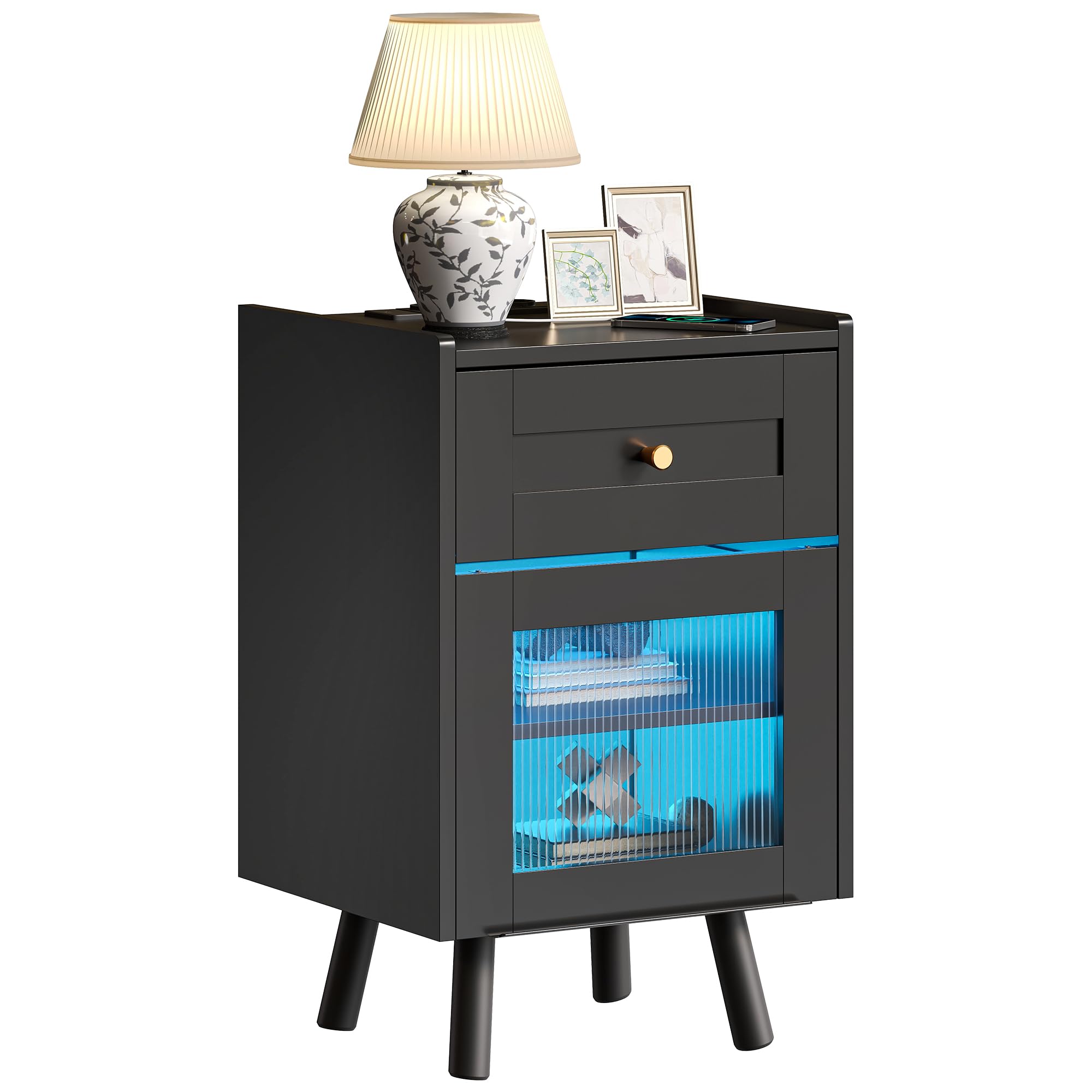 ✴️YITAHOME Mesita de Noche con Barra de luz LED de 7 Colores, Armario de Noche con cajón y Estante Ajustable, Mesa Auxiliar de Almacenamiento Negra para Dormitorio, salón, 40 x 35 x 62 cm, Negro #Publicidad