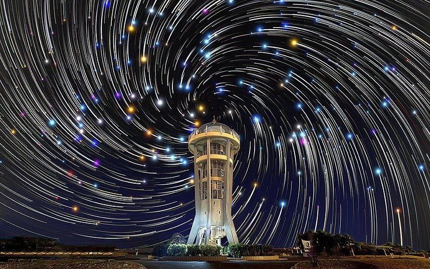 Спираль «звездных троп» в ночном небе над водохранилищем в Сингапуре.