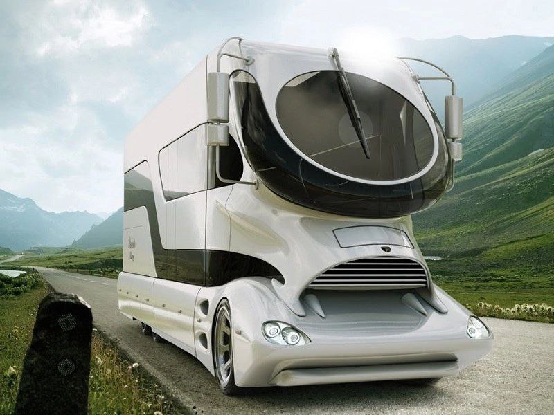 Двухэтажный мобильный дом класса люкс весит 20 тонн,под его капотом 500 л.с. В наличии трап, как у самолета бизнес-класса, выхлопная система спортивного авто и самая эффектная часть – терраса, расположенная прямо на крыше. Она автоматически поднимается нажатием одной кнопки и оснащена баром и системой отопления.
