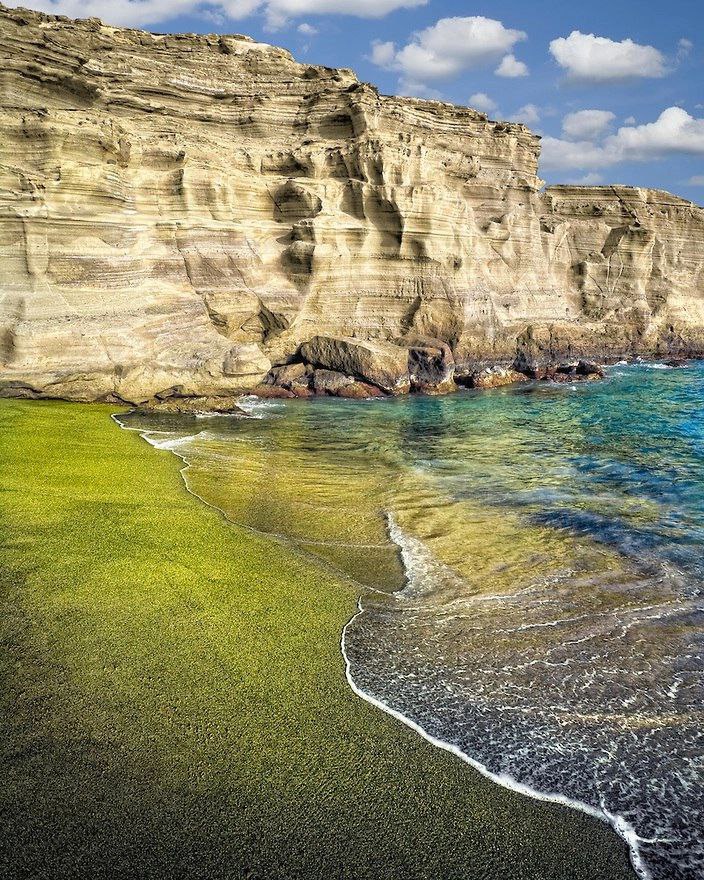 Такой цвет песка объясняется присутствием на побережье большого количества хризолита – полудрагоценного минерала вулканического происхождения, кристаллы которого известны как "гавайские бриллианты".