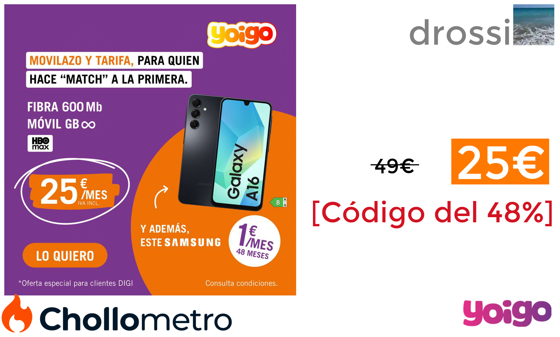 🔹YOIGO Fibra 600 + linea 5g ilimitada + HBO MAX (samsung galaxy A16 opcional por 1€ al mes 48 meses) 25€ (PVP: 49€) ❗️🔥