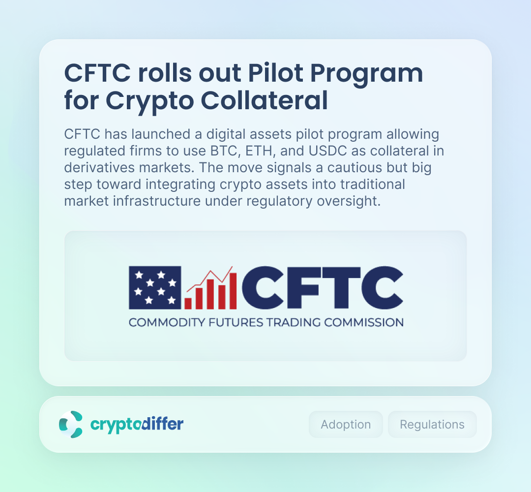 CFTC has launched a digital assets pilot program allowing regulated firms to use BTC, ETH, and USDC as collateral in derivatives markets. The move signals a big step toward integrating crypto assets into traditional markets under regulatory oversight.