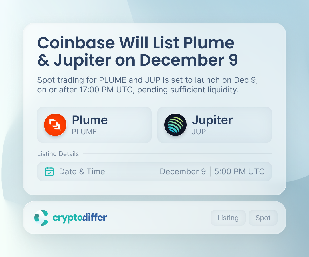 Spot trading for PLUME and JUP is set to launch on December 9, on or after 5:00 PM UTC, pending sufficient liquidity.