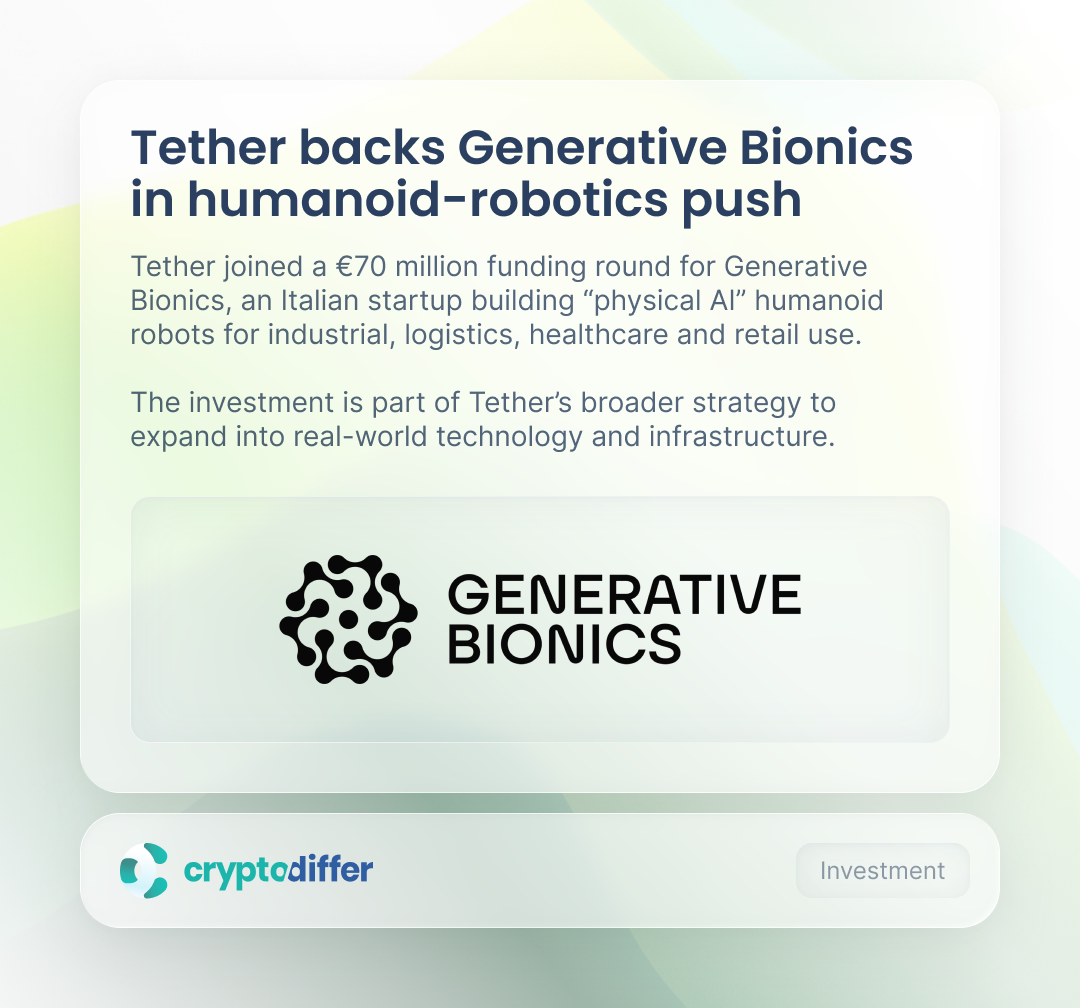Tether joined a €70 million funding round for Generative Bionics, an Italian startup building “physical AI” humanoid robots for industrial, logistics, healthcare and retail use.