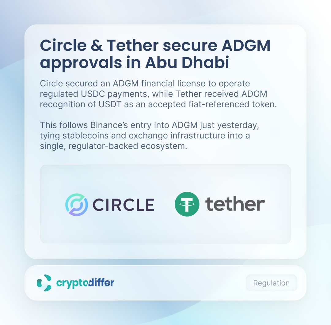 Circle secured an ADGM financial license to operate regulated USDC payment infrastructure, while Tether received official ADGM recognition of USDT as an accepted fiat-referenced token.