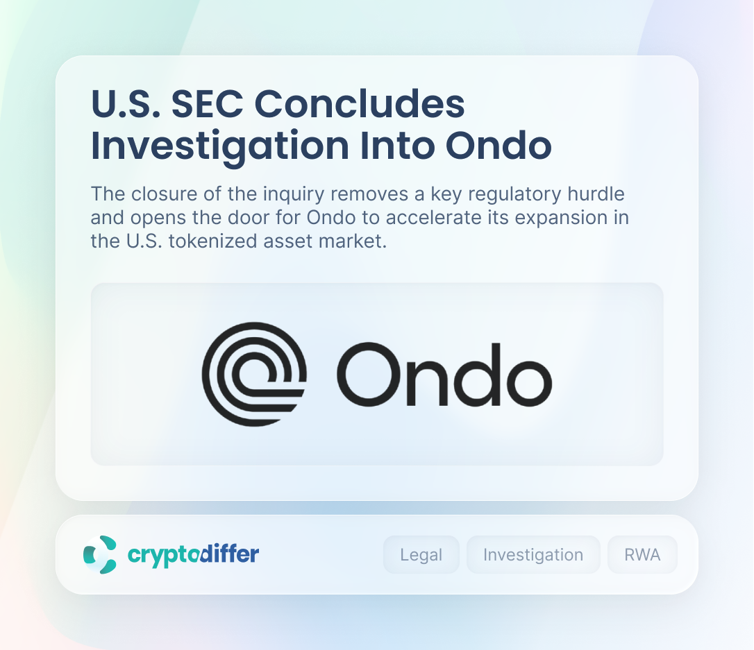 The closure of the inquiry removes a key regulatory hurdle and opens the door for Ondo to accelerate its expansion in the U.S. tokenized asset market.