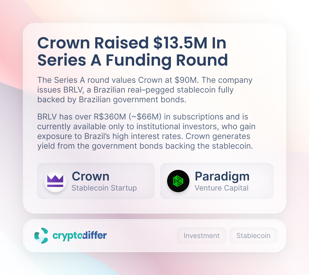 The Series A round values Crown at $90M. The company issues BRLV, a Brazilian real–pegged stablecoin fully backed by Brazilian government bonds.