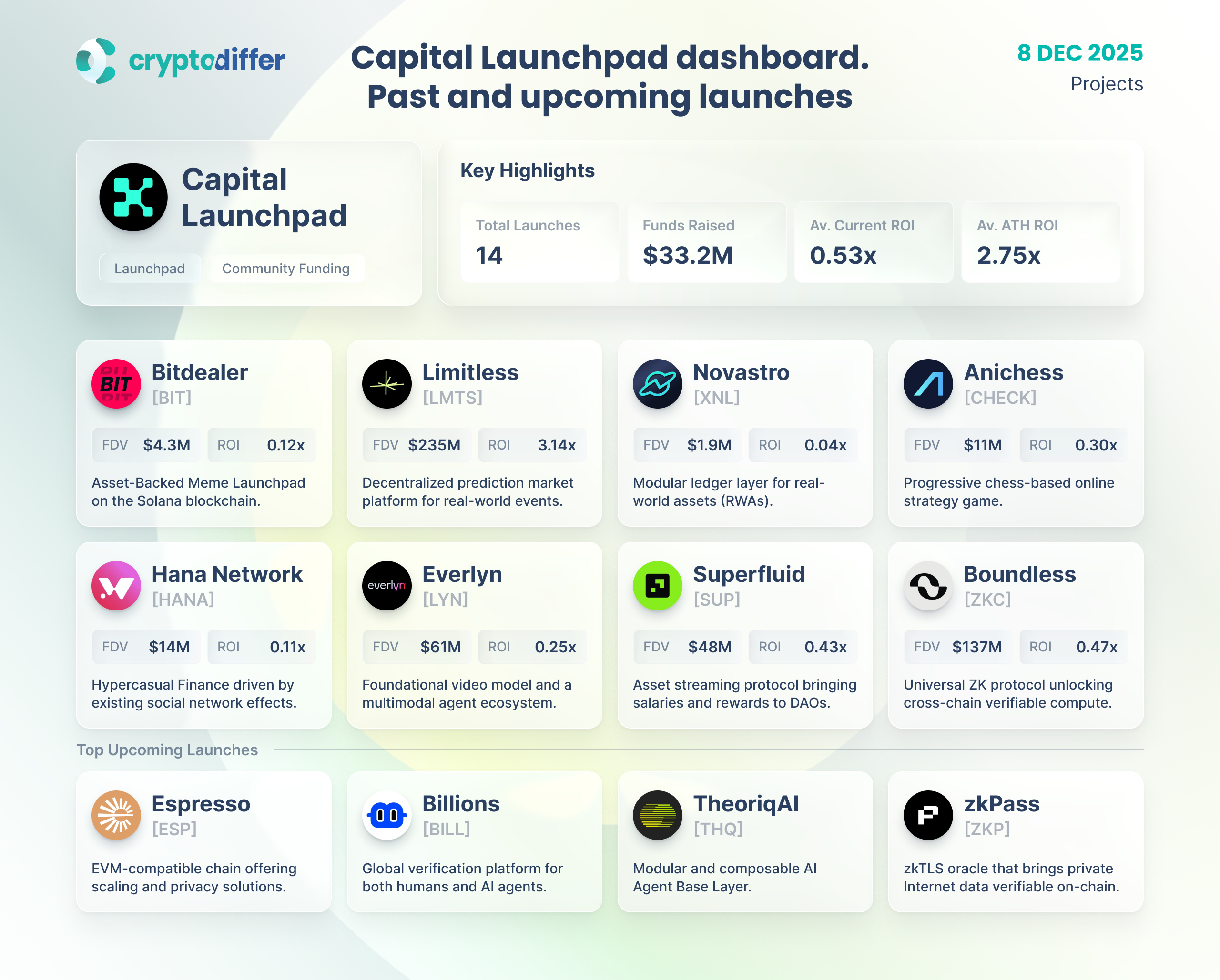 This dashboard tracks past launches like Limitless, Everlyn, Boundless and Superfluid — and highlights upcoming bets: Espresso, Billions, TheoriqAI and zkPass.