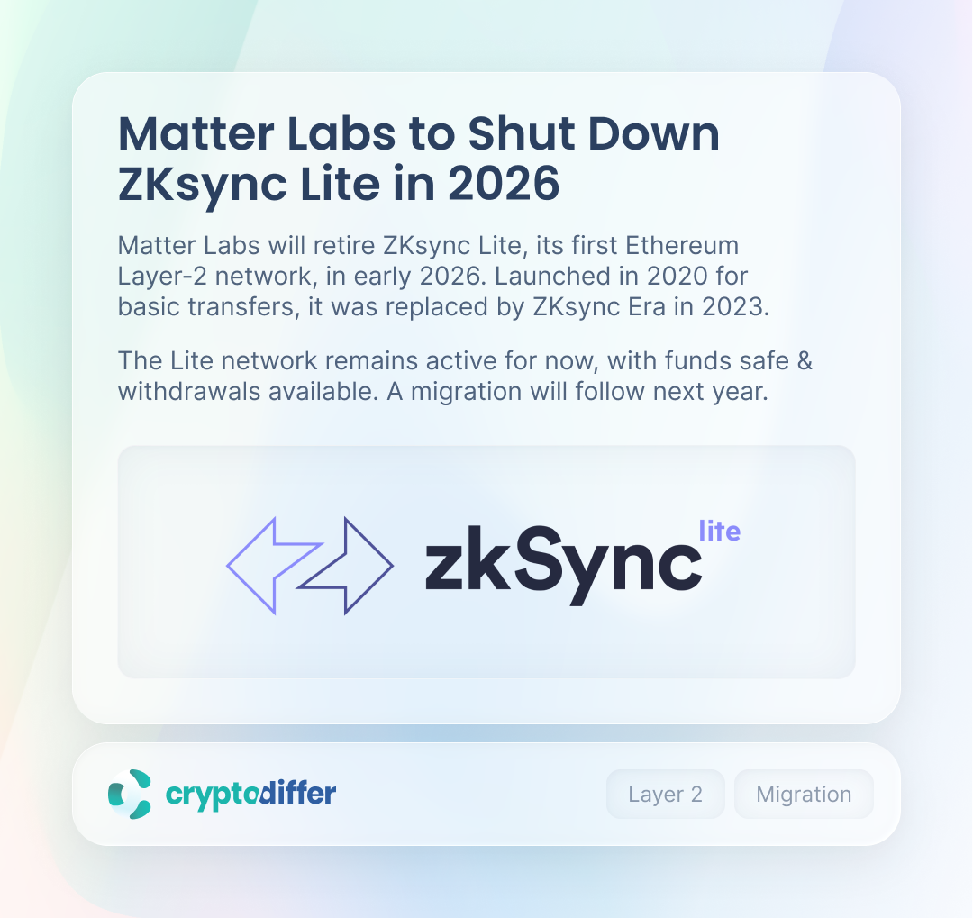 Matter Labs will retire ZKsync Lite, its first Ethereum layer-2 network, in early 2026. Launched in 2020 for basic transfers, it was replaced by ZKsync Era in 2023.