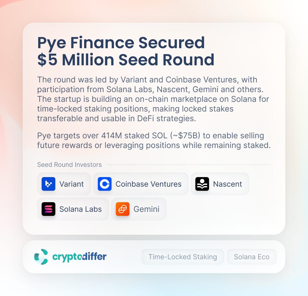 Additional investors include Solana Labs, Nascent, Gemini, and others. The startup is building an on-chain marketplace on Solana for time-locked staking positions, making locked stakes transferable and usable in DeFi strategies.