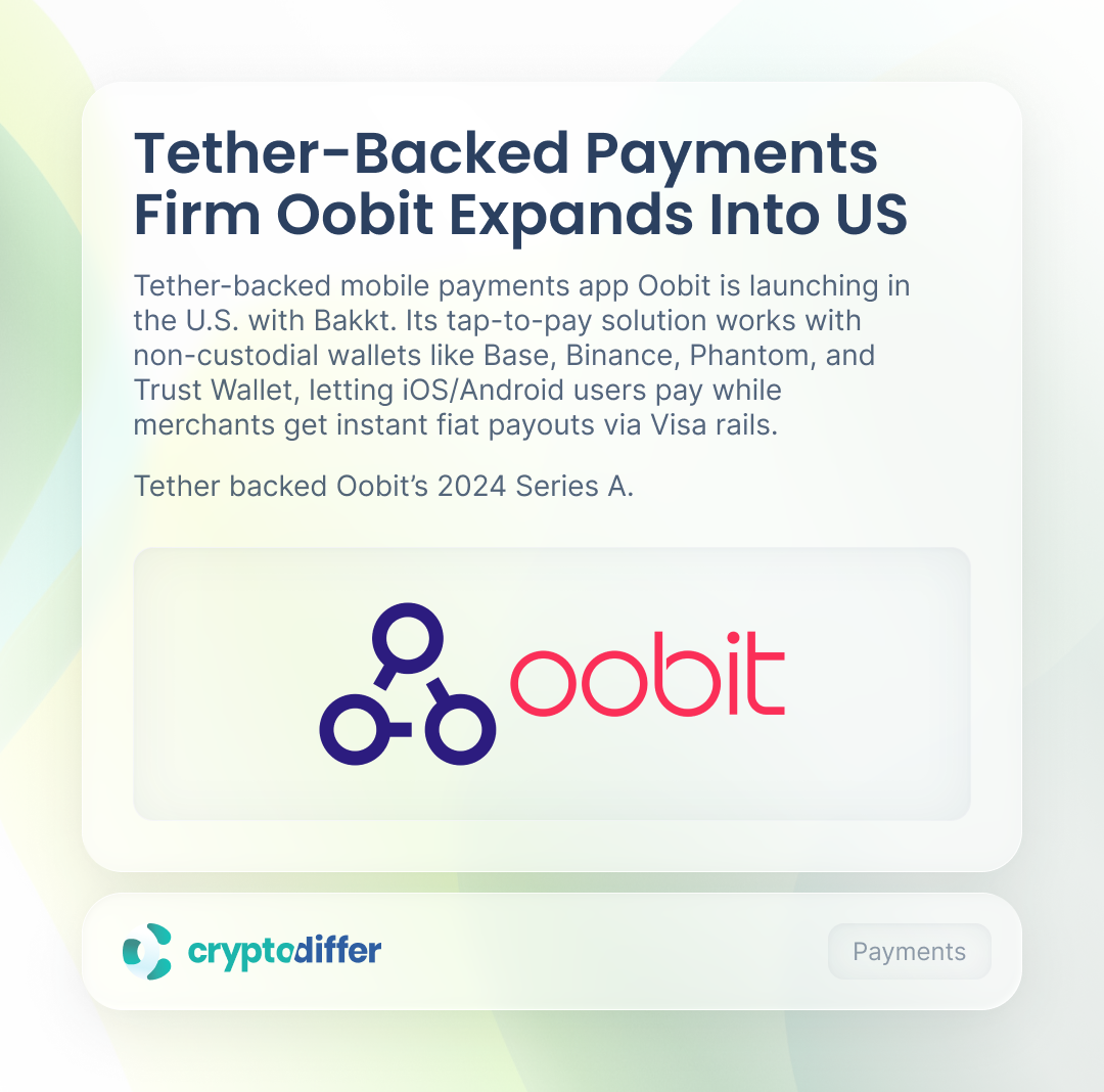 Tether-backed mobile payments app Oobit is launching in the U.S. with Bakkt. The tap-to-pay solution works with non-custodial wallets like Base, Binance, Phantom, and Trust Wallet, letting iOS/Android users pay while merchants get instant fiat payouts via Visa rails. Tether backed Oobit’s 2024 Series A.