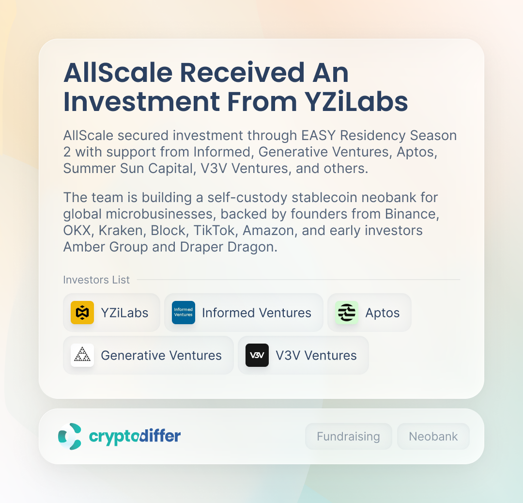 AllScale Gets YZiLabs Backing for Self-Custody Stablecoin Neobank
