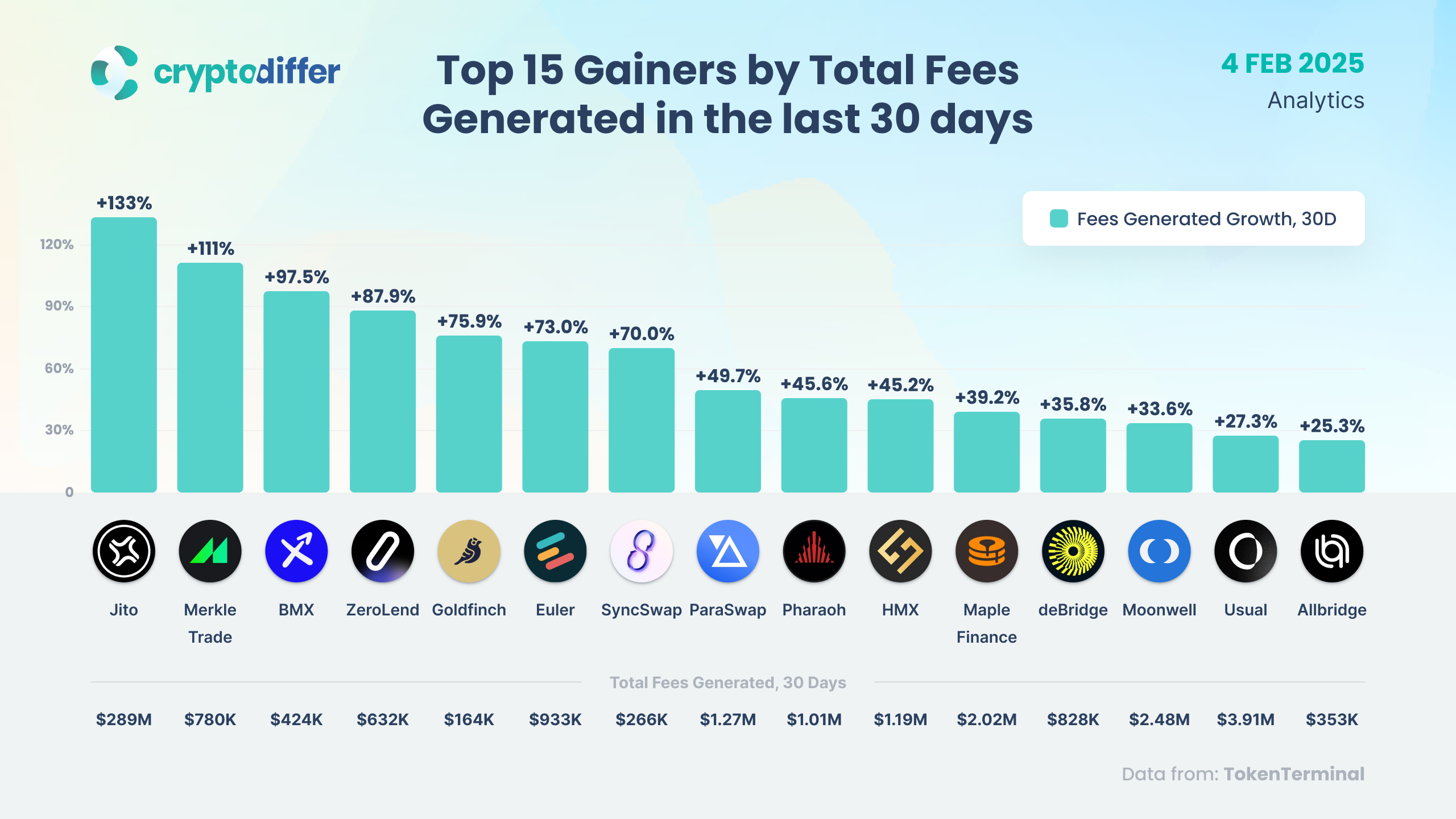 Top 15 Gainers by Total Fees Generated in the last 30 days
