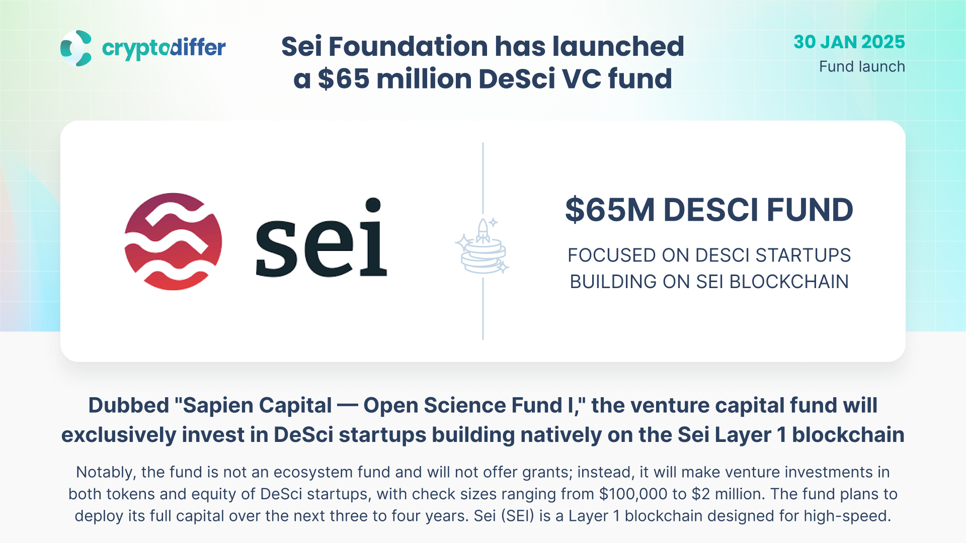 Dubbed "Sapien Capital — Open Science Fund I," the venture capital fund will exclusively invest in DeSci startups building natively on the Sei. The fund plans to deploy its full capital over the next three to four years. Sei is a Layer 1 blockchain designed for high-speed.