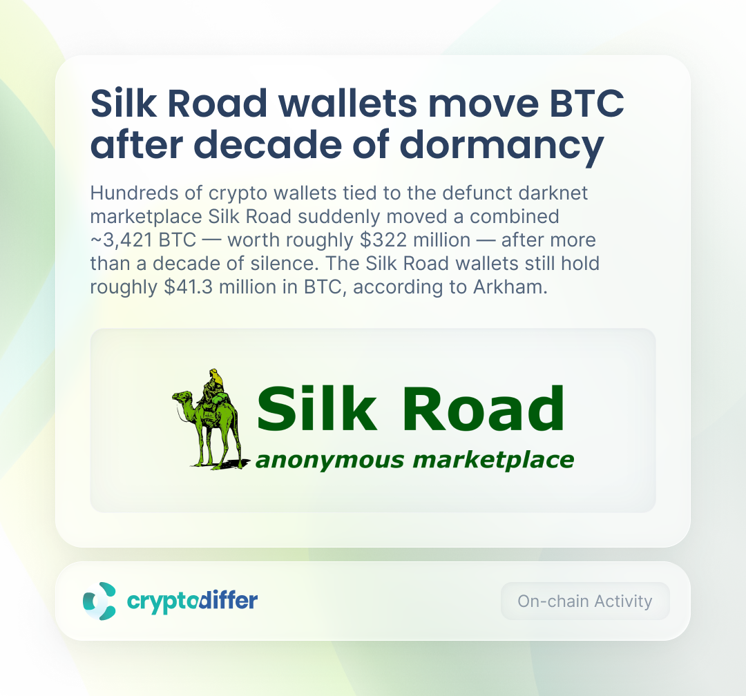 Hundreds of crypto wallets linked to the defunct darknet marketplace Silk Road suddenly moved a combined ~3,421 BTC — worth roughly $322M — after more than a decade of silence. The Silk Road wallets still hold roughly $41.3M in BTC, according to Arkham.