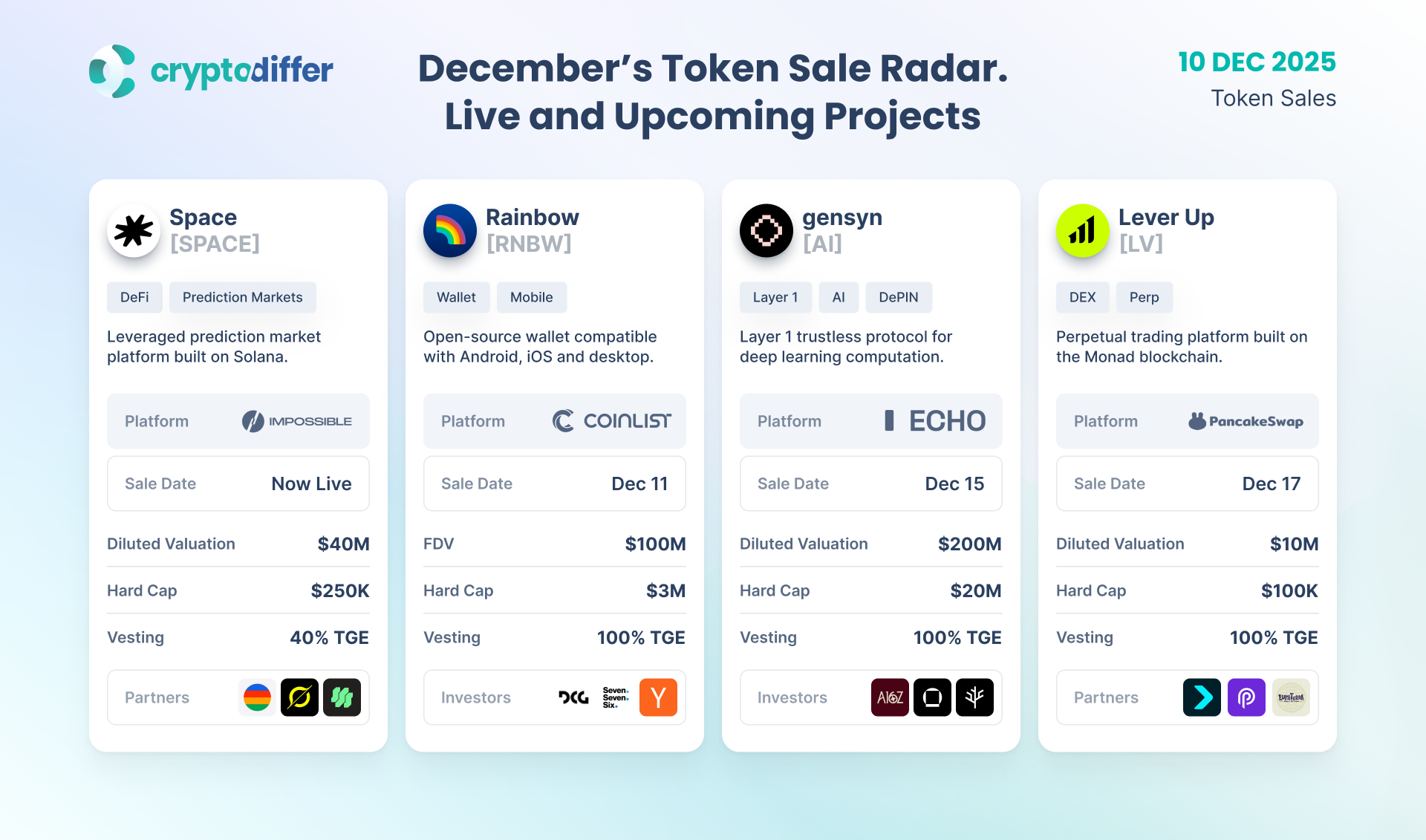 December is packed with high-profile token sales across Impossible, CoinList, Echo and Cake Pad. From Prediction Markets to AI and DePIN, here are the top projects scheduled to launch this month.