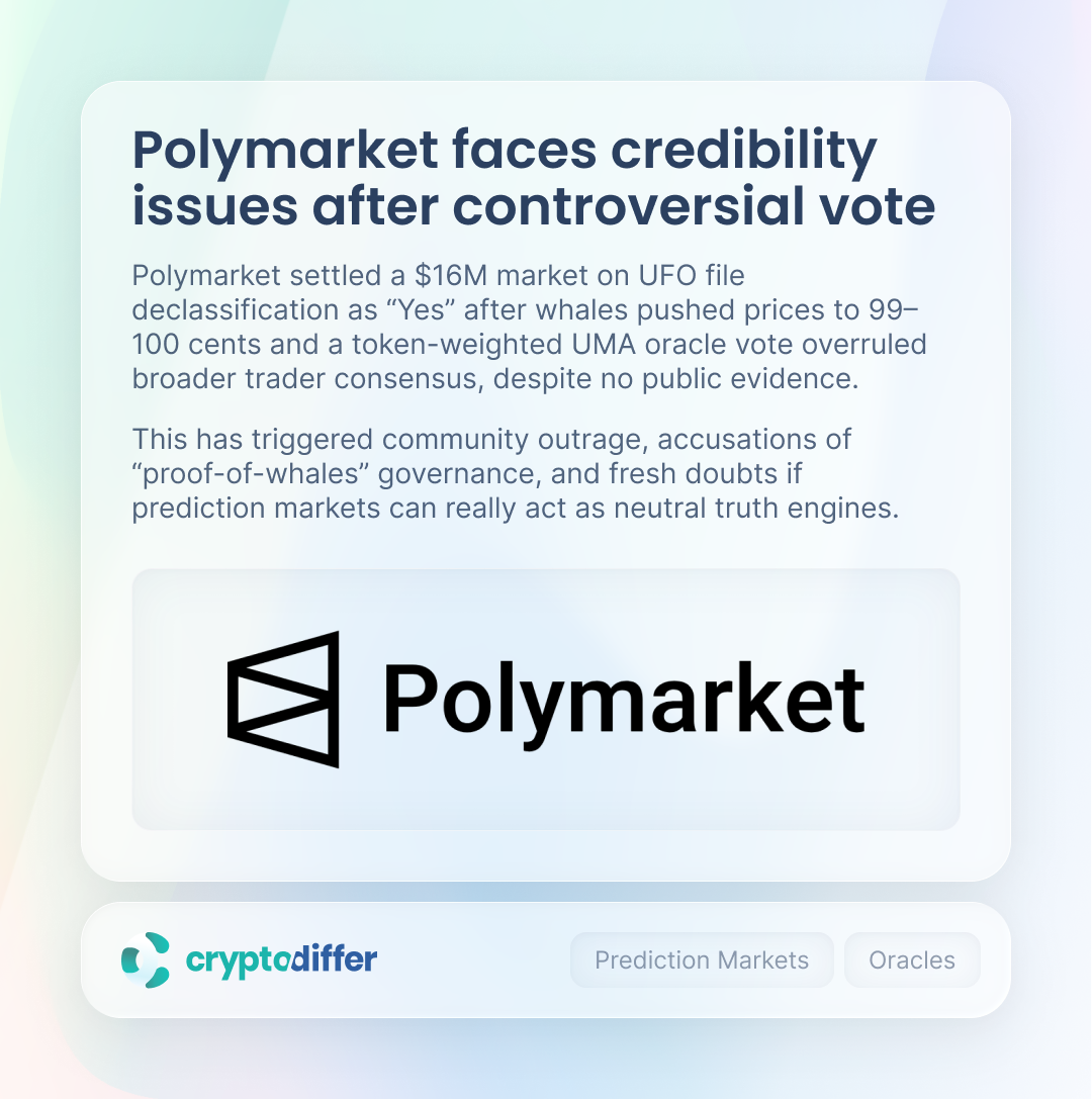 Polymarket settled a $16M market on UFO file declassification as “Yes” after whales pushed prices to 99–100 cents and a token-weighted UMA oracle vote overruled broader trader consensus, despite no public evidence.