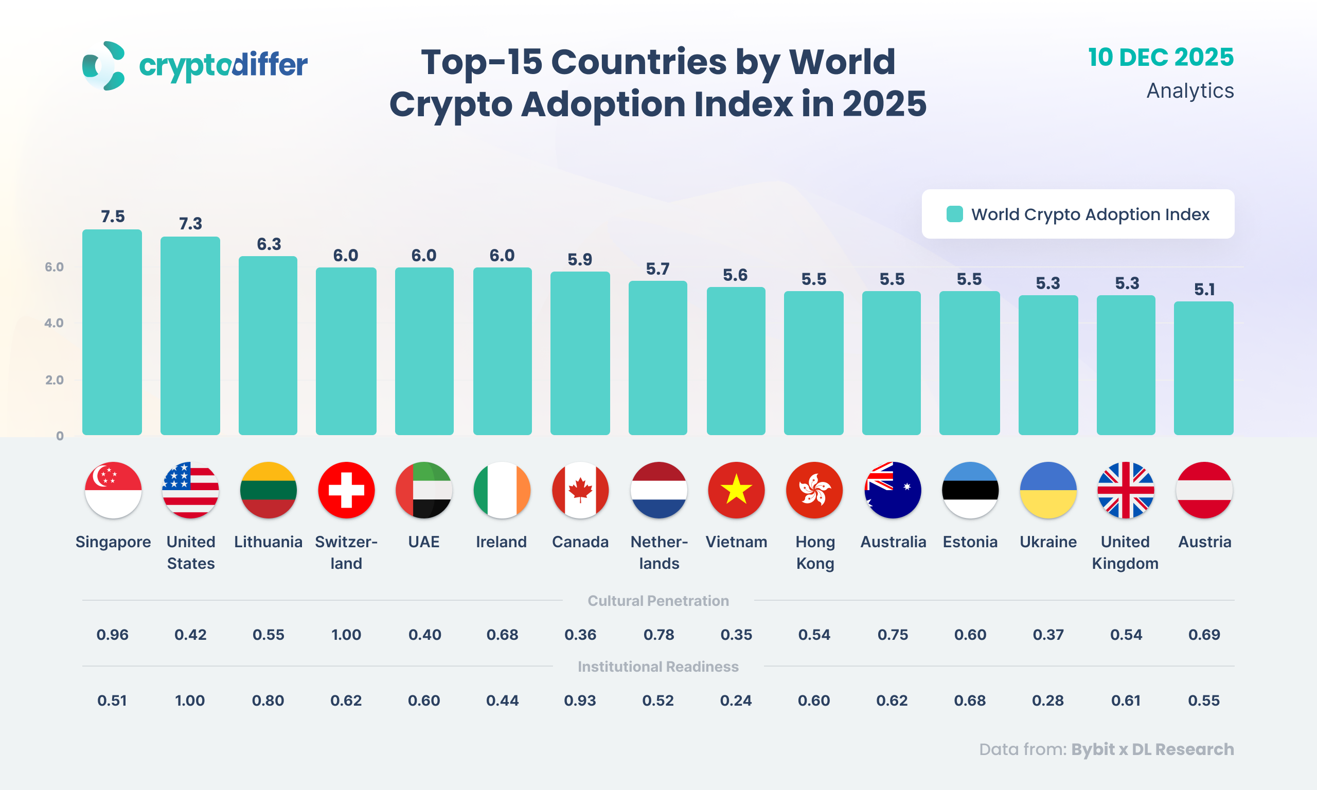 Bybit x DL Research has released its latest report ranking the top countries by crypto adoption in 2025. The index highlights how cultural penetration, transactional use, user penetration and institutional readiness drive adoption.