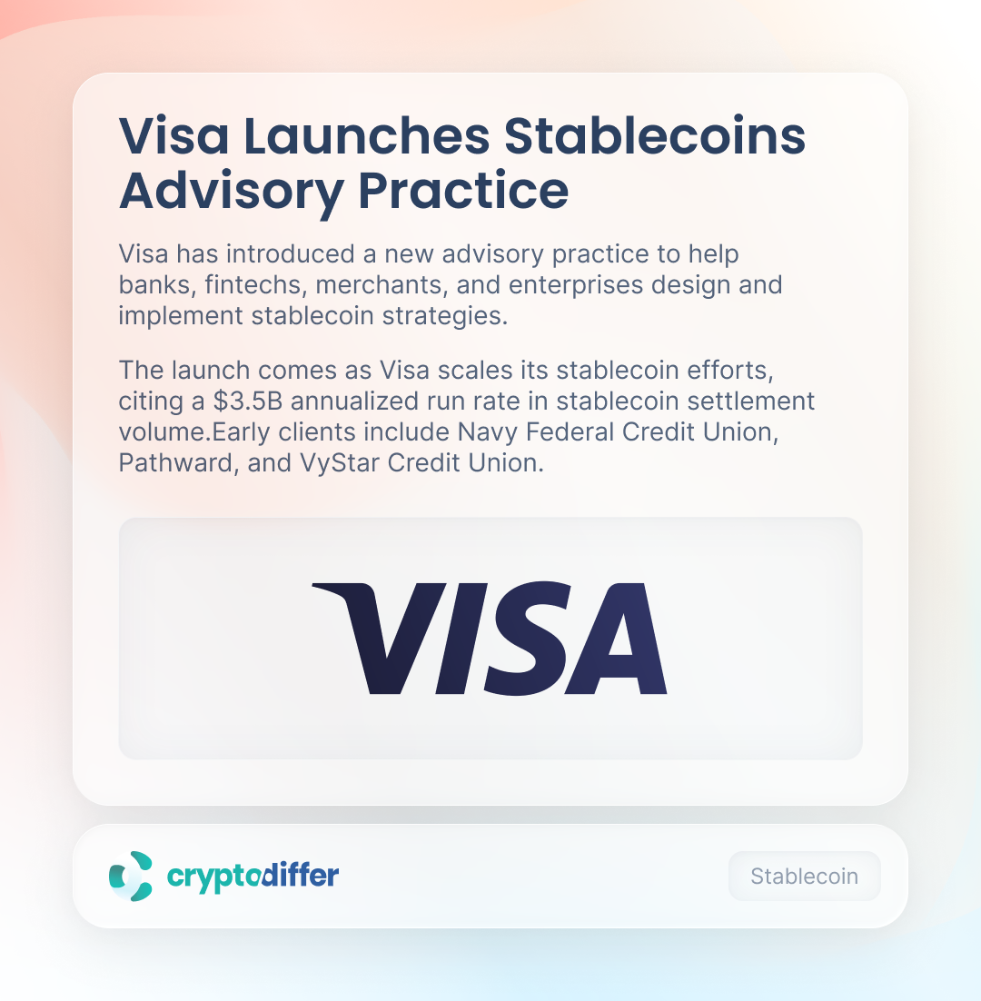 The launch comes as Visa scales its stablecoin efforts, citing a $3.5B annualized run rate in stablecoin settlement volume. Early clients include Navy Federal Credit Union, Pathward, VyStar Credit Union.