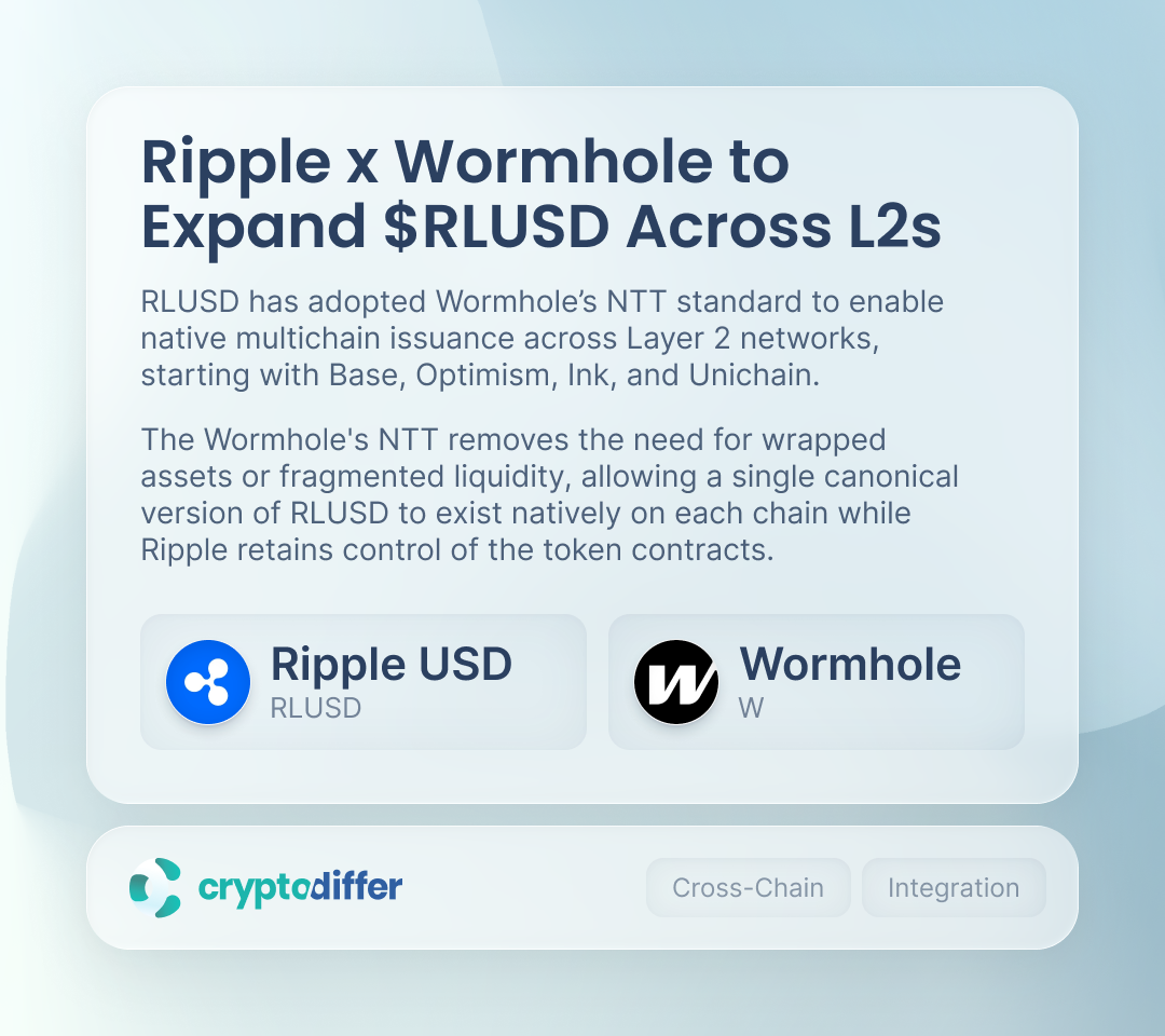 RLUSD has adopted Wormhole’s NTT standard to enable native multichain issuance across Layer 2 networks, starting with Base, Optimism, Ink, and Unichain.