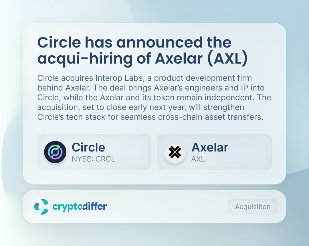 Circle acquires Interop Labs, a product and system development firm behind Axelar. The deal brings Axelar’s engineers and IP into Circle, while the Axelar and its token remain independent.