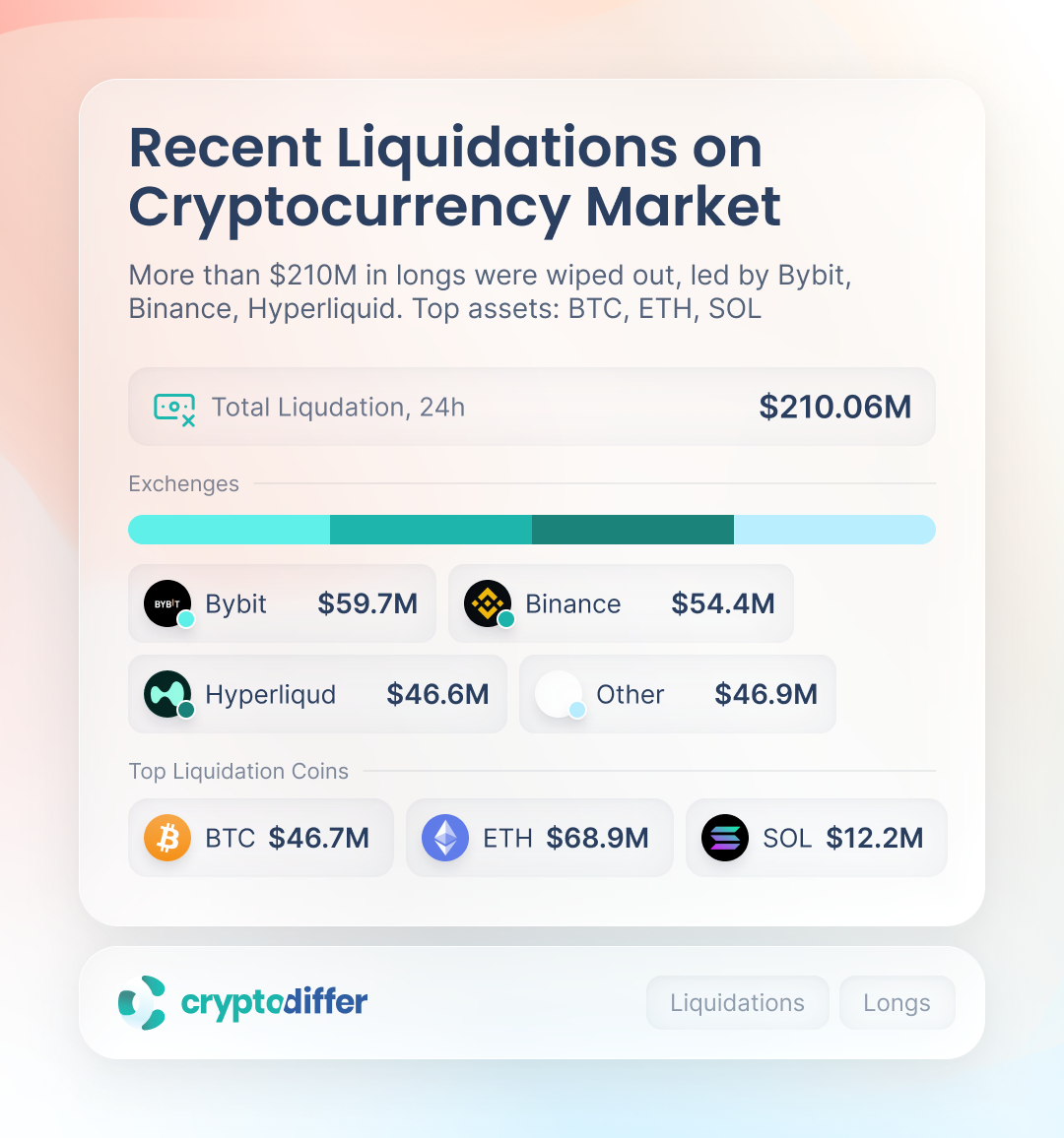 More than $210 million in longs were wiped out, led by Bybit ($59.7M), Binance ($54.4M), and Hyperliquid ($46.6M). Top assets hit were Bitcoin ($46.7M), Ethereum ($68.9M), and Solana ($12.2M).