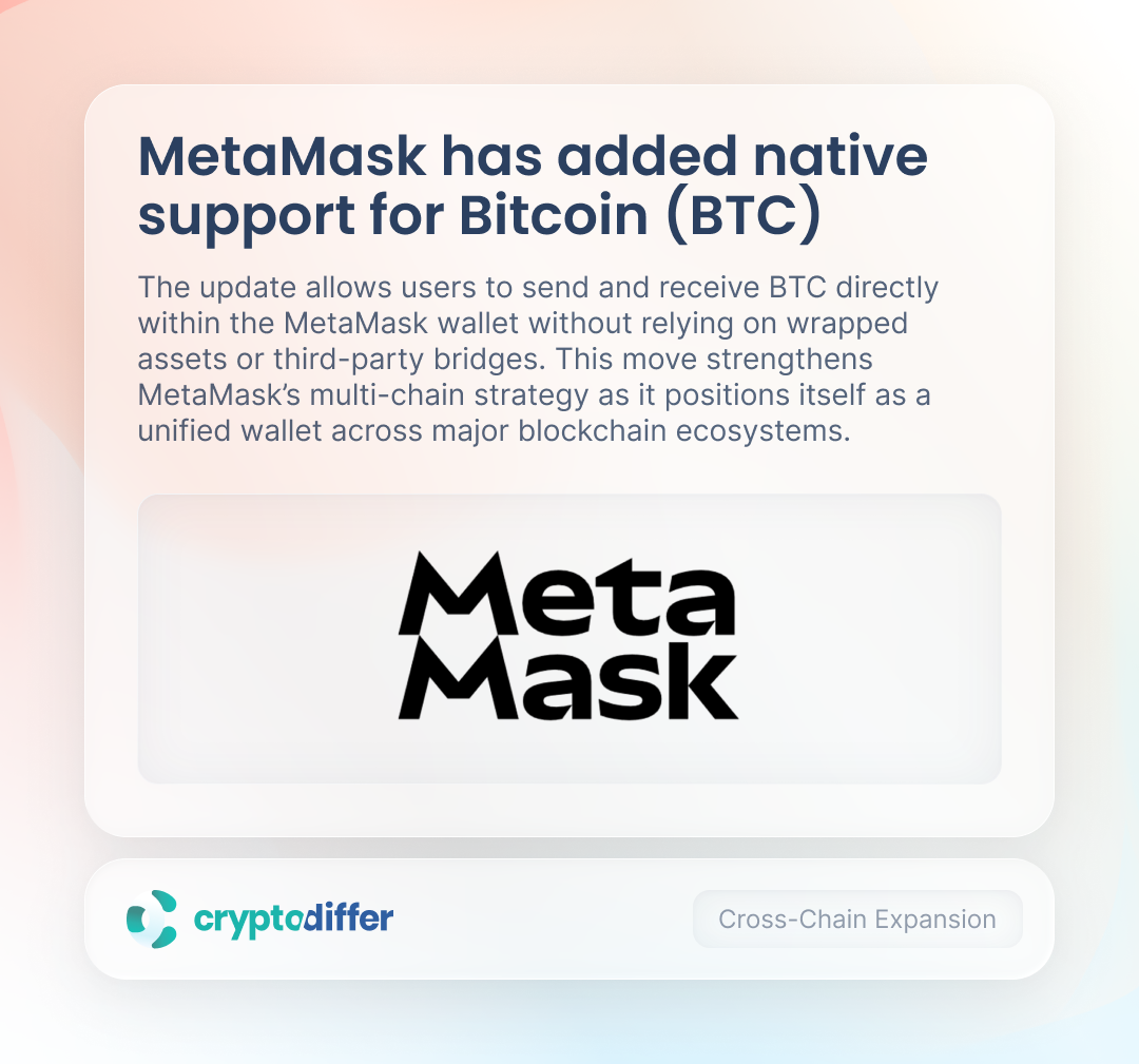 The update allows users to send and receive BTC directly within the MetaMask wallet without relying on wrapped assets or third-party bridges. This move strengthens MetaMask’s multi-chain strategy and positions it as a unified wallet across major ecosystems.
