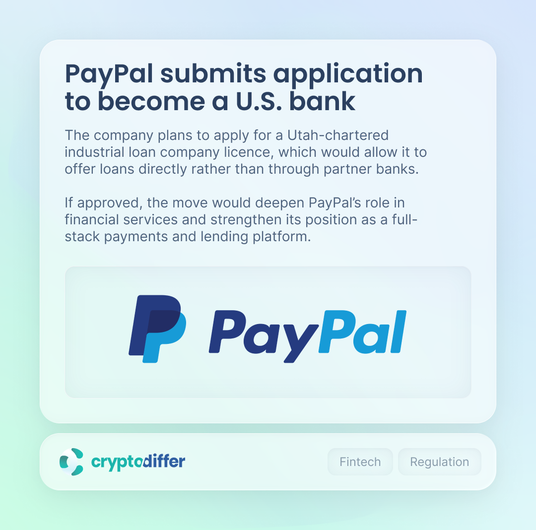 The company plans to apply for a Utah-chartered industrial loan company licence. If approved, the move would deepen PayPal’s role in financial services and strengthen its position as a full-stack payments and lending platform.