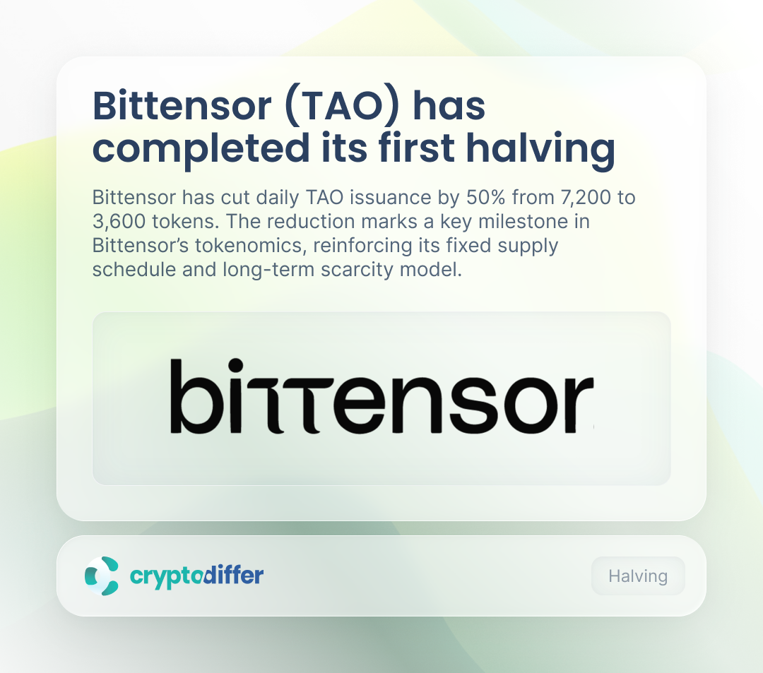 Bittensor has cut daily TAO issuance by 50% from 7,200 to 3,600 tokens. The reduction marks a key milestone in TAO tokenomics, reinforcing its fixed supply schedule and long-term scarcity model.