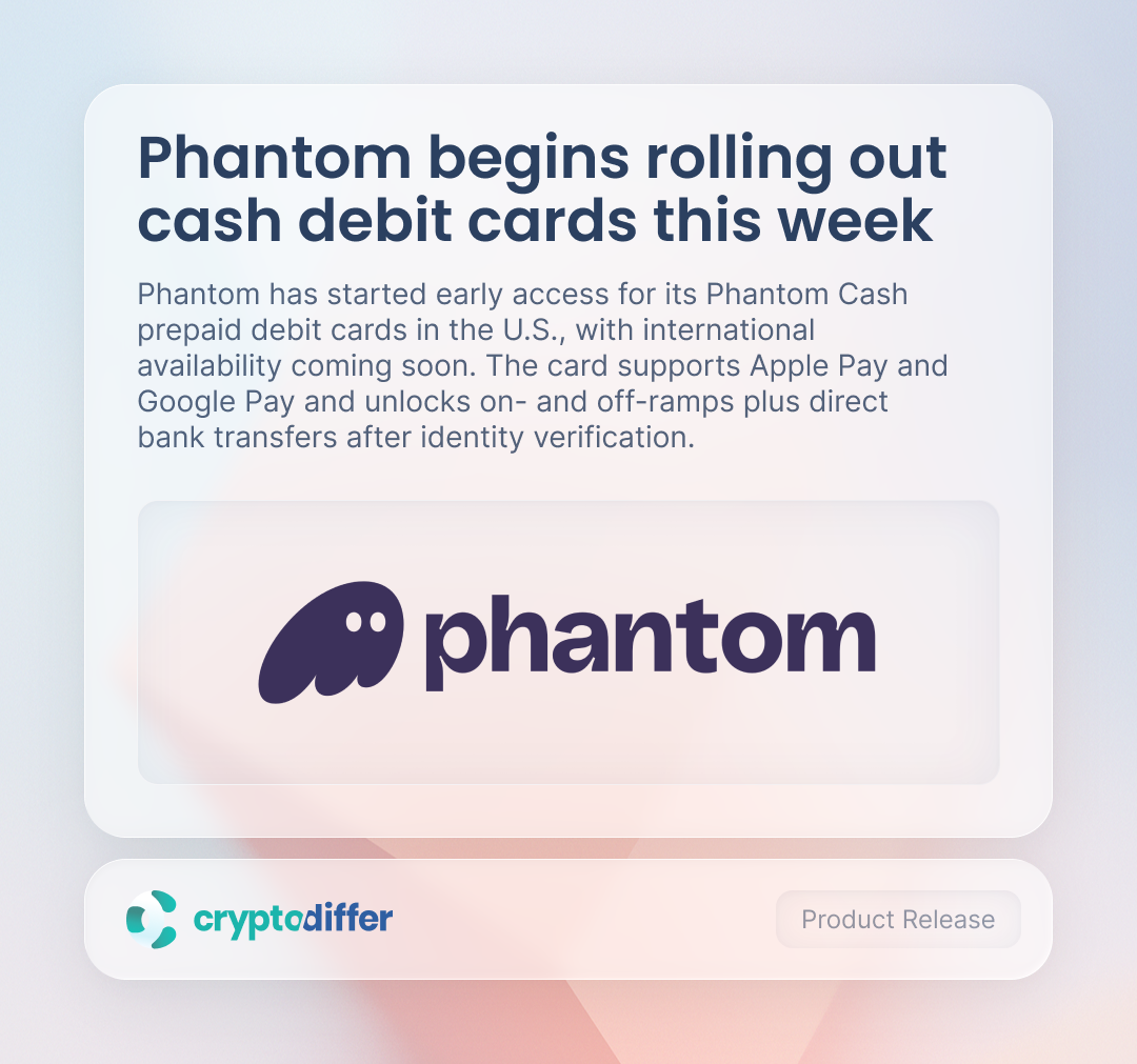 Phantom has started early access for its Phantom Cash prepaid debit cards in the U.S., with international availability coming soon. The card supports Apple Pay and Google Pay and unlocks on- and off-ramps plus direct bank transfers after identity verification.