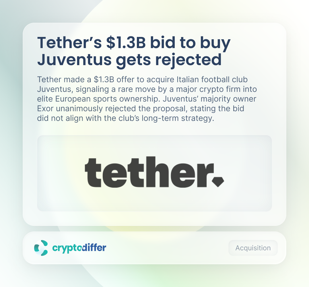 Tether made a $1.3B offer to acquire Italian football club, signaling a rare move by a major crypto firm into elite sports ownership. Juventus’ majority owner Exor unanimously rejected the proposal, stating the bid did not align with the club’s long-term strategy.