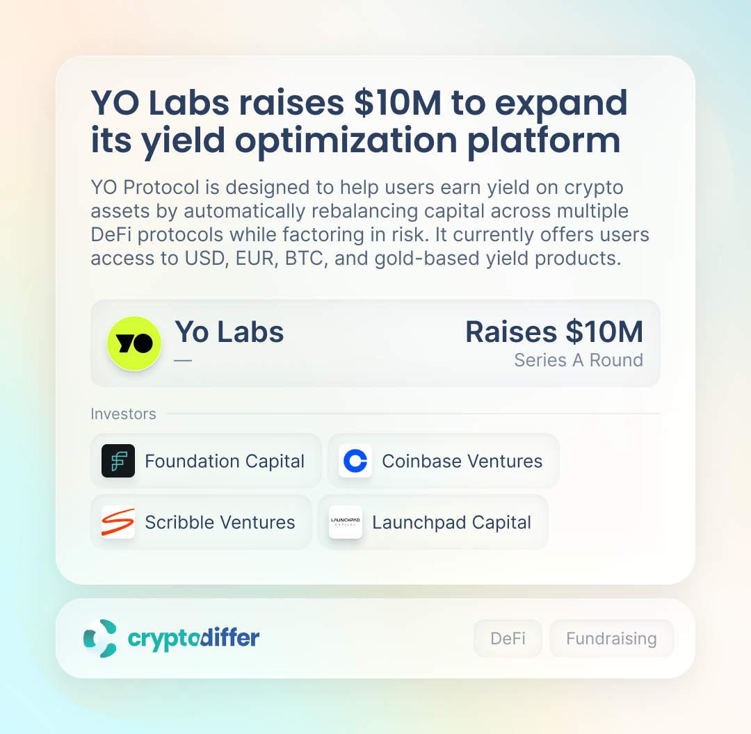 YO Protocol is designed to help users earn yield on crypto assets by automatically rebalancing capital across multiple DeFi protocols while factoring in risk. It currently offers users access to USD, EUR, BTC, and gold-based yield products.
