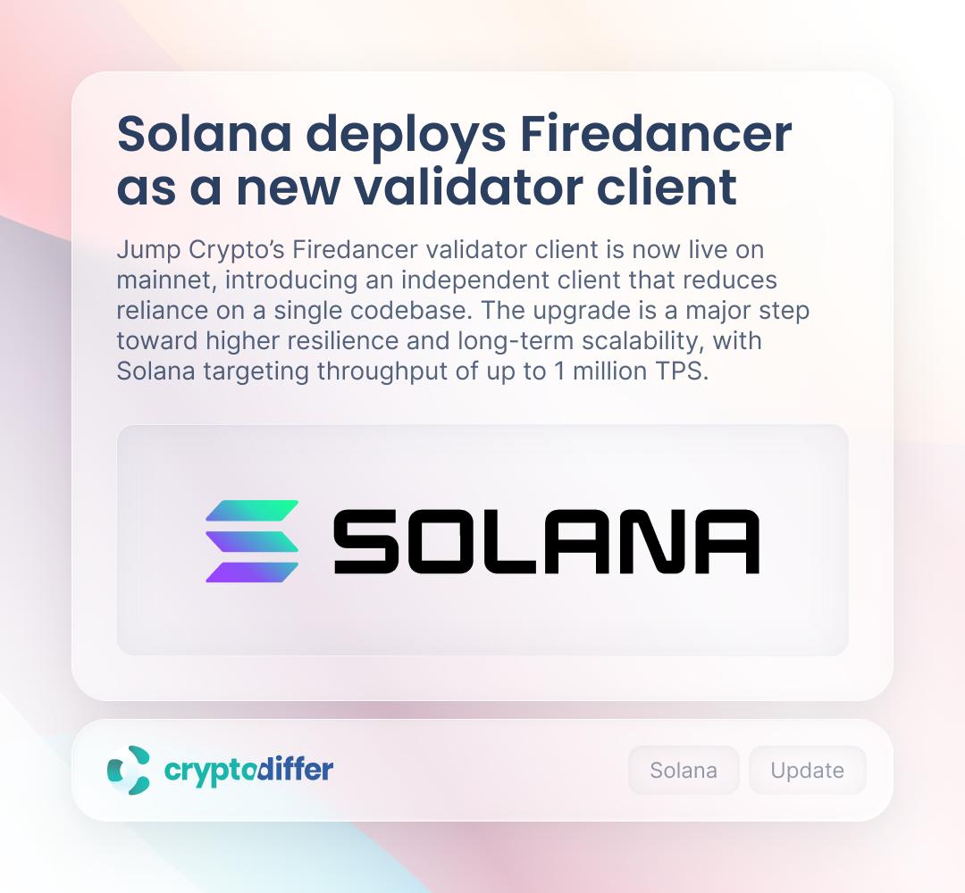 Jump Crypto’s Firedancer introduces an independent client that reduces reliance on a single codebase. The upgrade is a major step toward higher resilience and long-term scalability, with Solana targeting throughput of up to 1 million TPS.