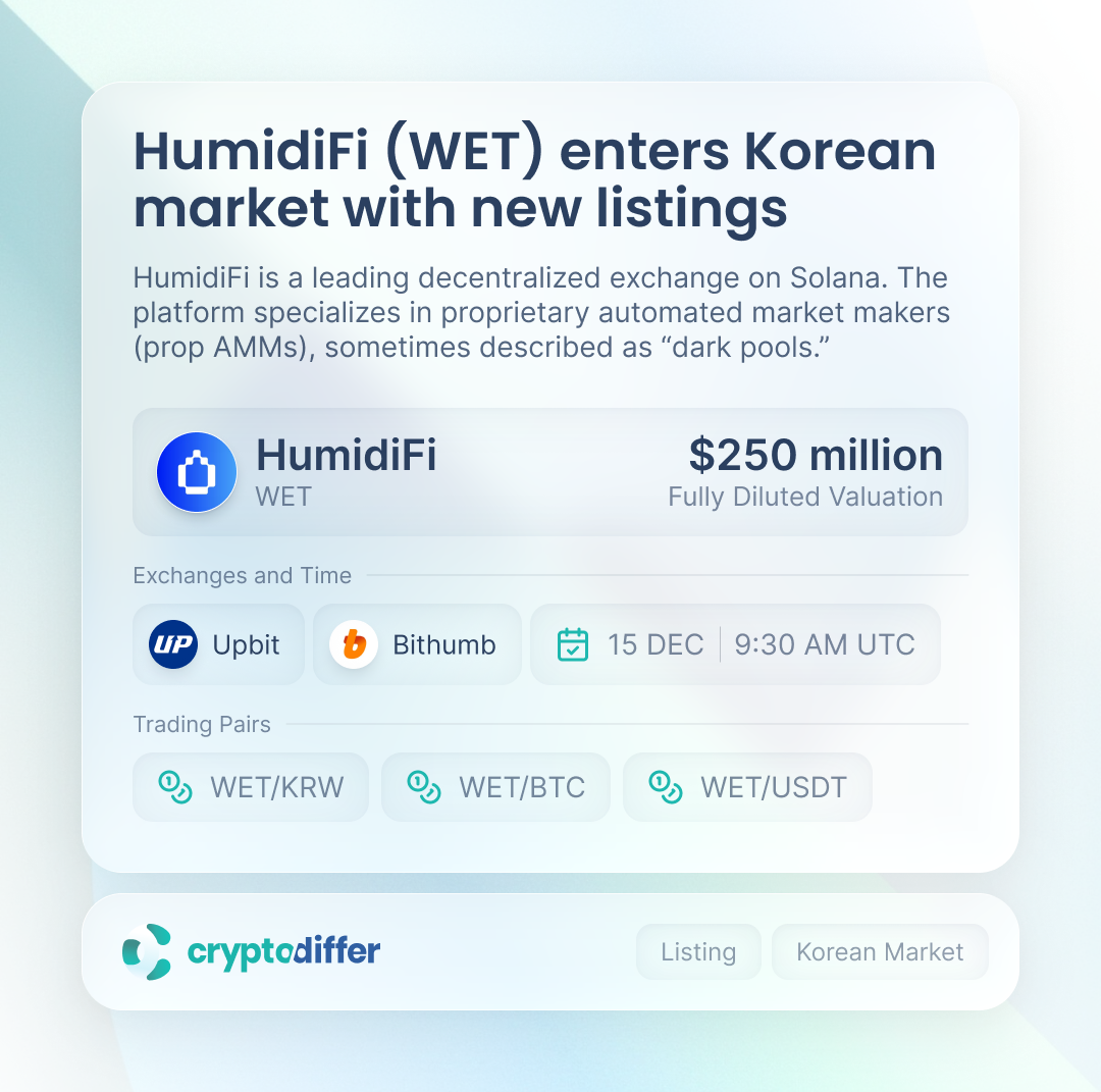 Upbit and Bithumb announced WET listing today, at 9:30 AM UTC. HumidiFi is a leading decentralized exchange on Solana. The platform specializes in proprietary automated market makers (prop AMMs), sometimes described as “dark pools.”