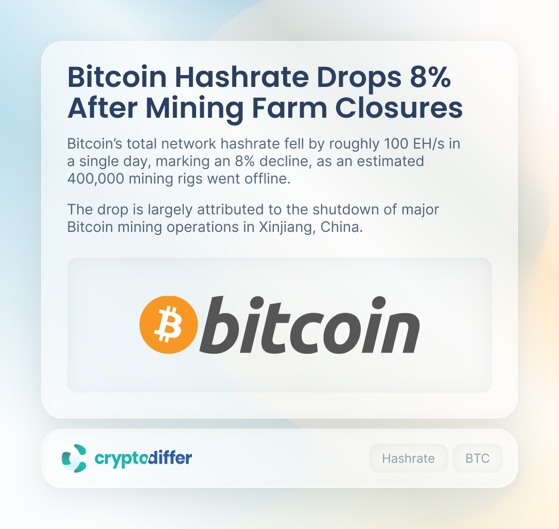 Bitcoin’s total network hashrate fell by roughly 100 EH/s in a single day, marking an 8% decline, as an estimated 400,000 mining rigs went offline.